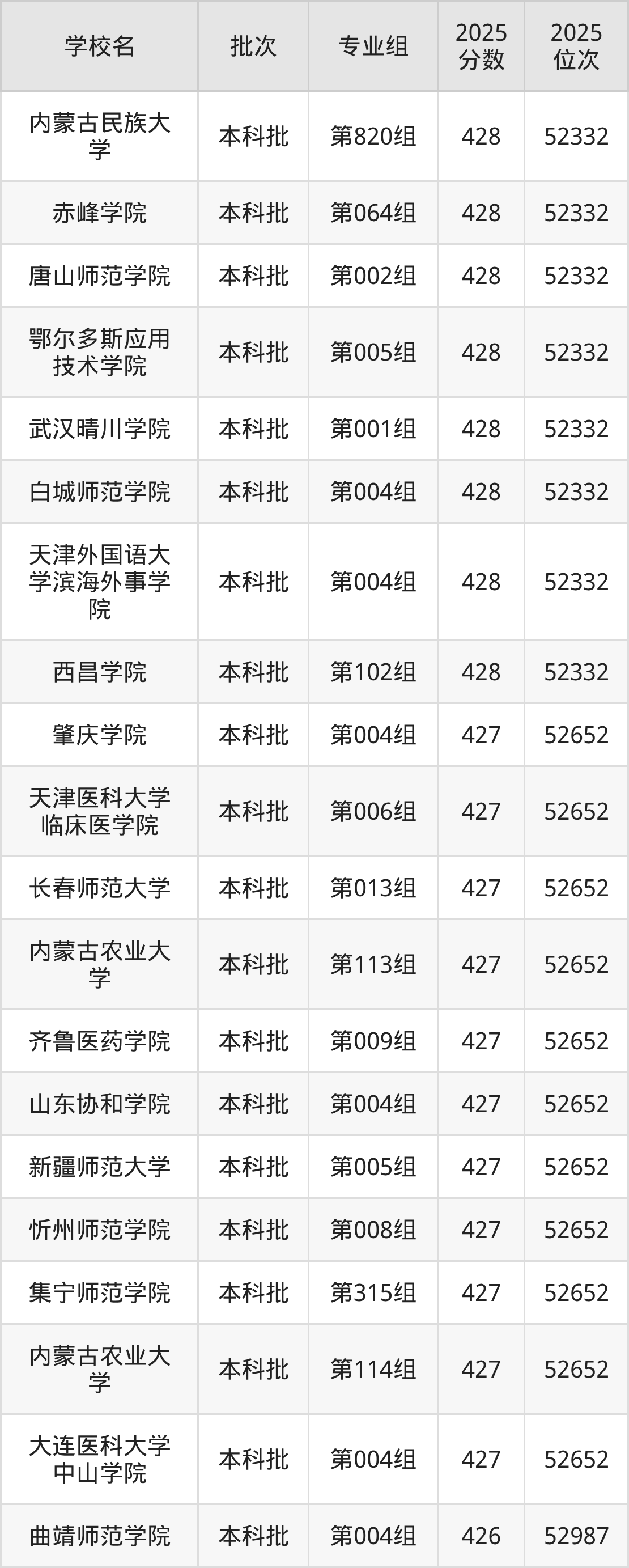 二、内蒙古426分位次排名能上的大学