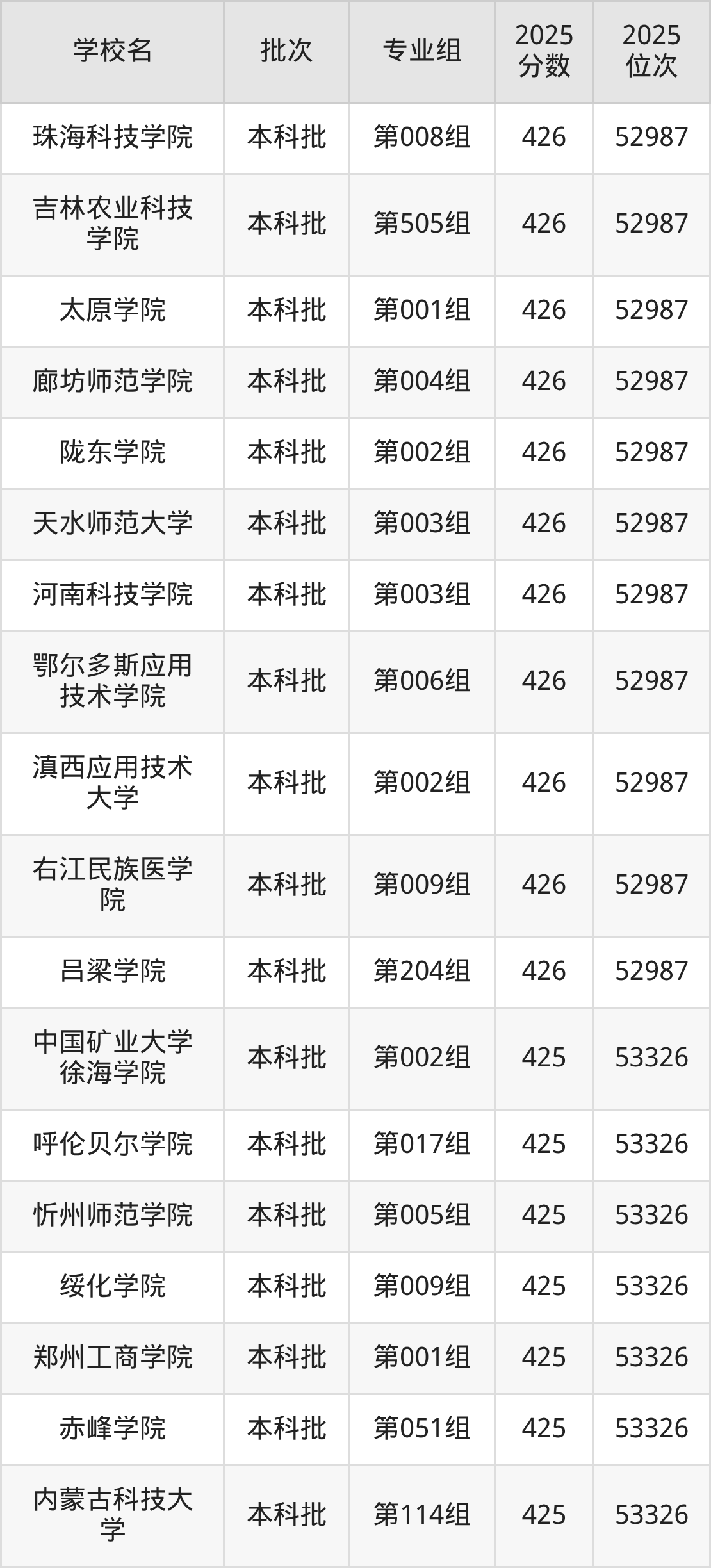 2025年内蒙古高考物理类426分(52653名~52987名)能上的大学有吕梁学院第204组、右江民族医学院第009组、滇西应用技术大学第002组、鄂尔多斯应用技术学院第006组等。