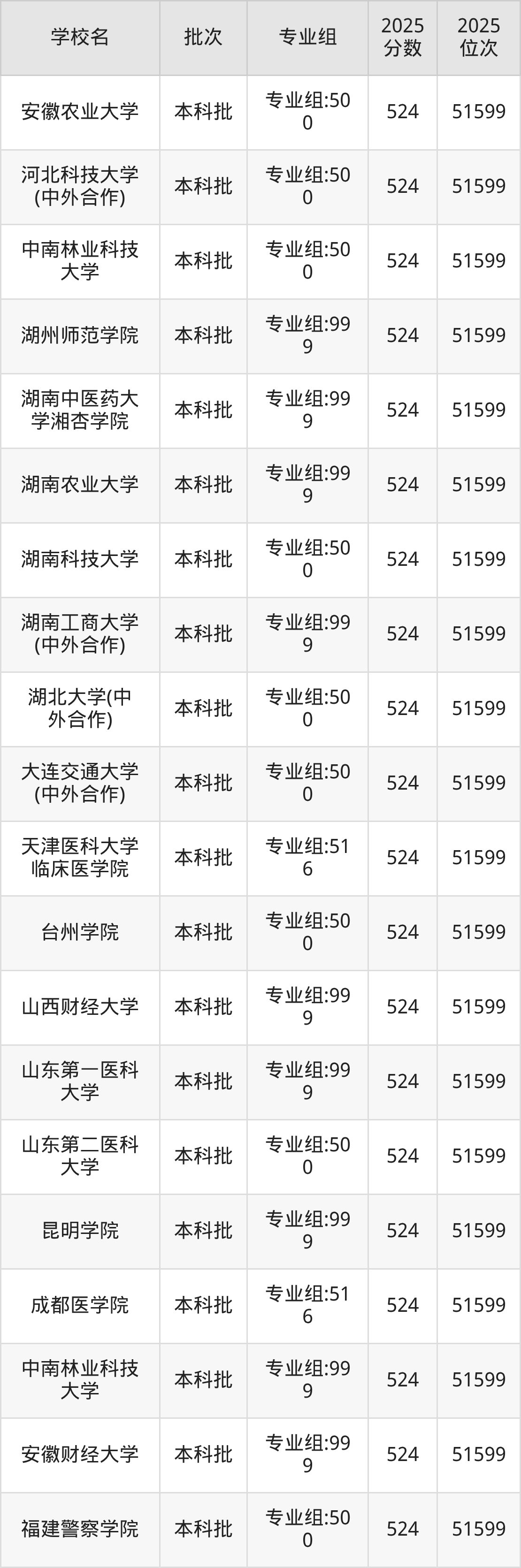 2025年福建高考物理类524分(50882名~51599名)能上的大学有福建警察学院专业组:500、安徽财经大学专业组:999、安徽农业大学专业组:500、成都医学院专业组:516等。