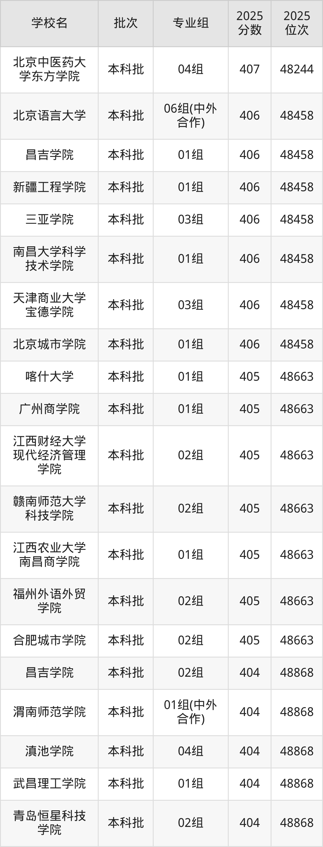 2025年上海高考406分(48245名~48458名)能上的大学有北京城市学院01组、天津商业大学宝德学院03组、南昌大学科学技术学院01组、三亚学院03组等。