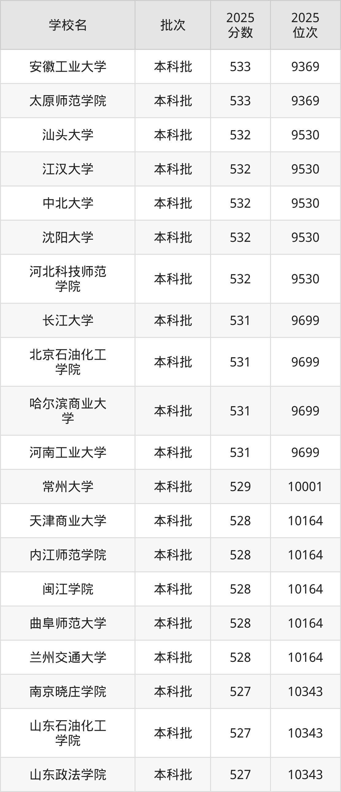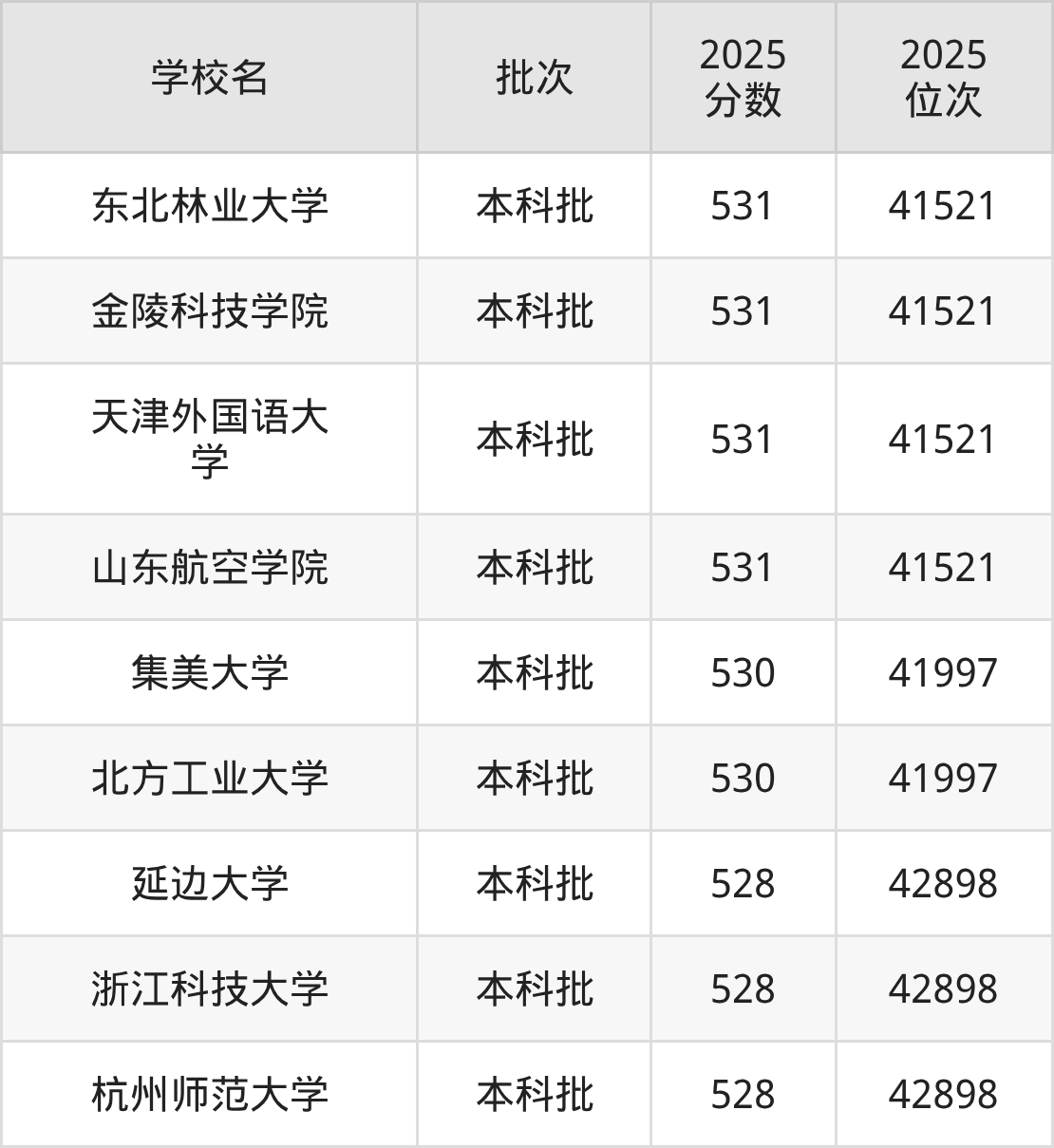 2025年辽宁高考物理类529分(41998名~42471名)录取位次低于该区间(较稳妥)的有延边大学(42898名)、杭州师范大学(42898名)等;录取位次高于该区间(可冲)的有北方工业大学(41997名)、集美大学(41997名)等。