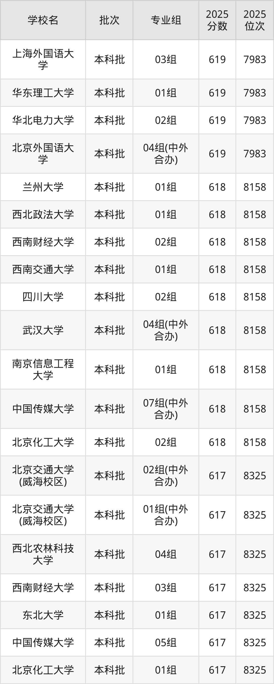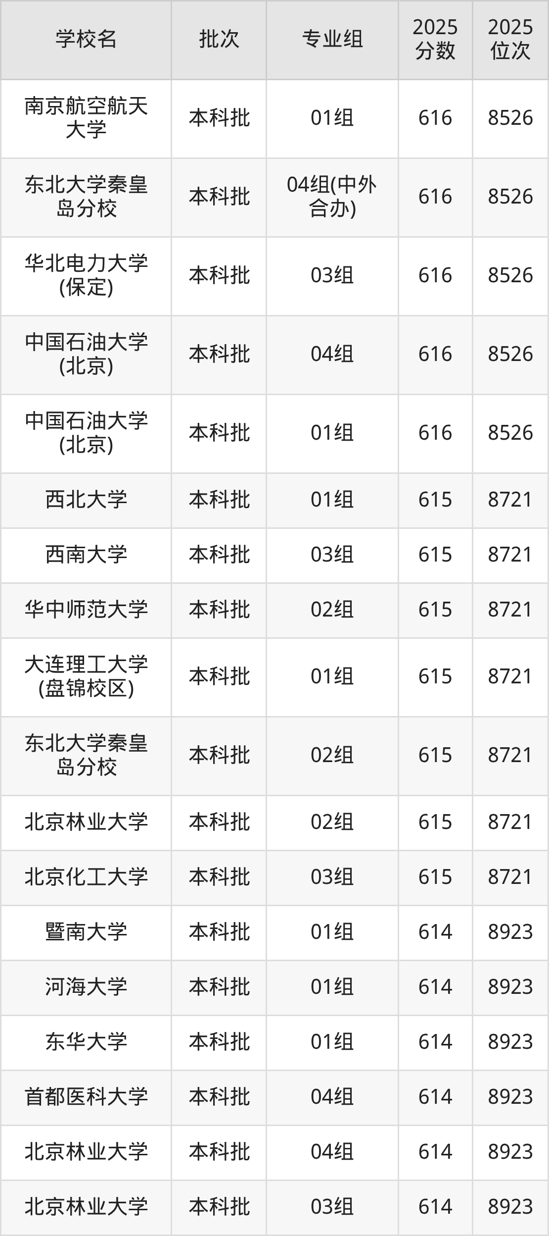 2025年北京高考616分(8326名~8526名)能上的大学有中国石油大学(北京)01组、中国石油大学(北京)04组、华北电力大学(保定)03组、东北大学秦皇岛分校04组(中外合办)等。
