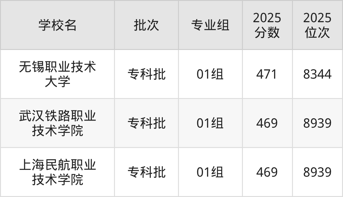 2025年江苏高考历史类469分(8630名~8939名)能上的大学有上海民航职业技术学院01组、武汉铁路职业技术学院01组。