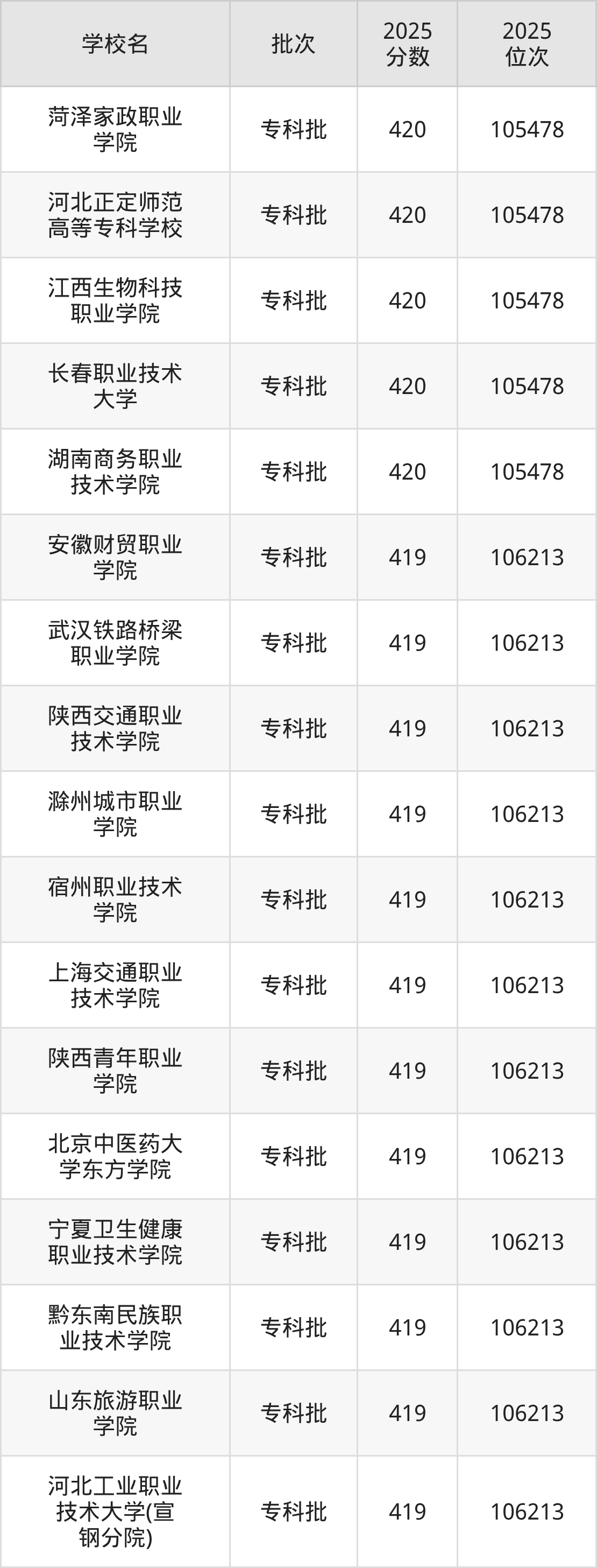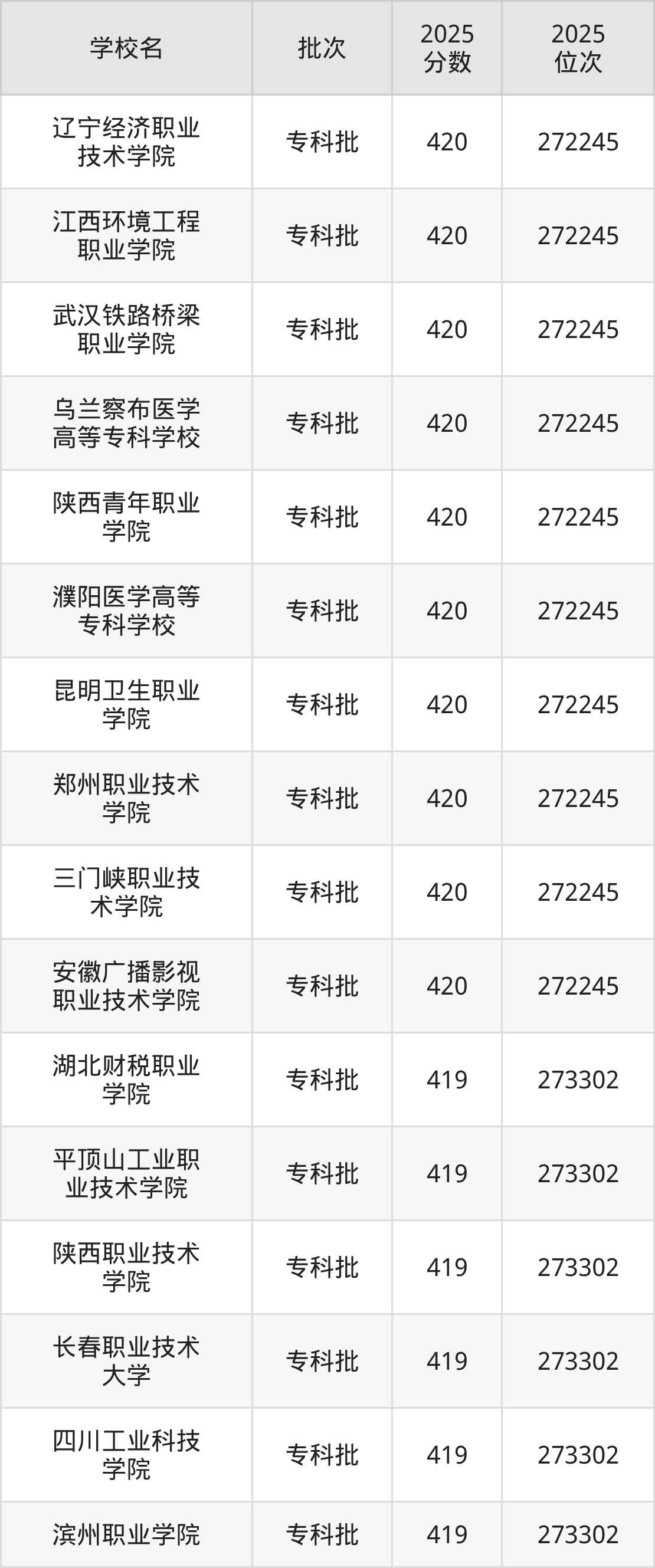 2025年河北高考物理类419分(272246名~273302名)能上的大学有湖北财税职业学院、平顶山工业职业技术学院、陕西职业技术学院、长春职业技术大学等。