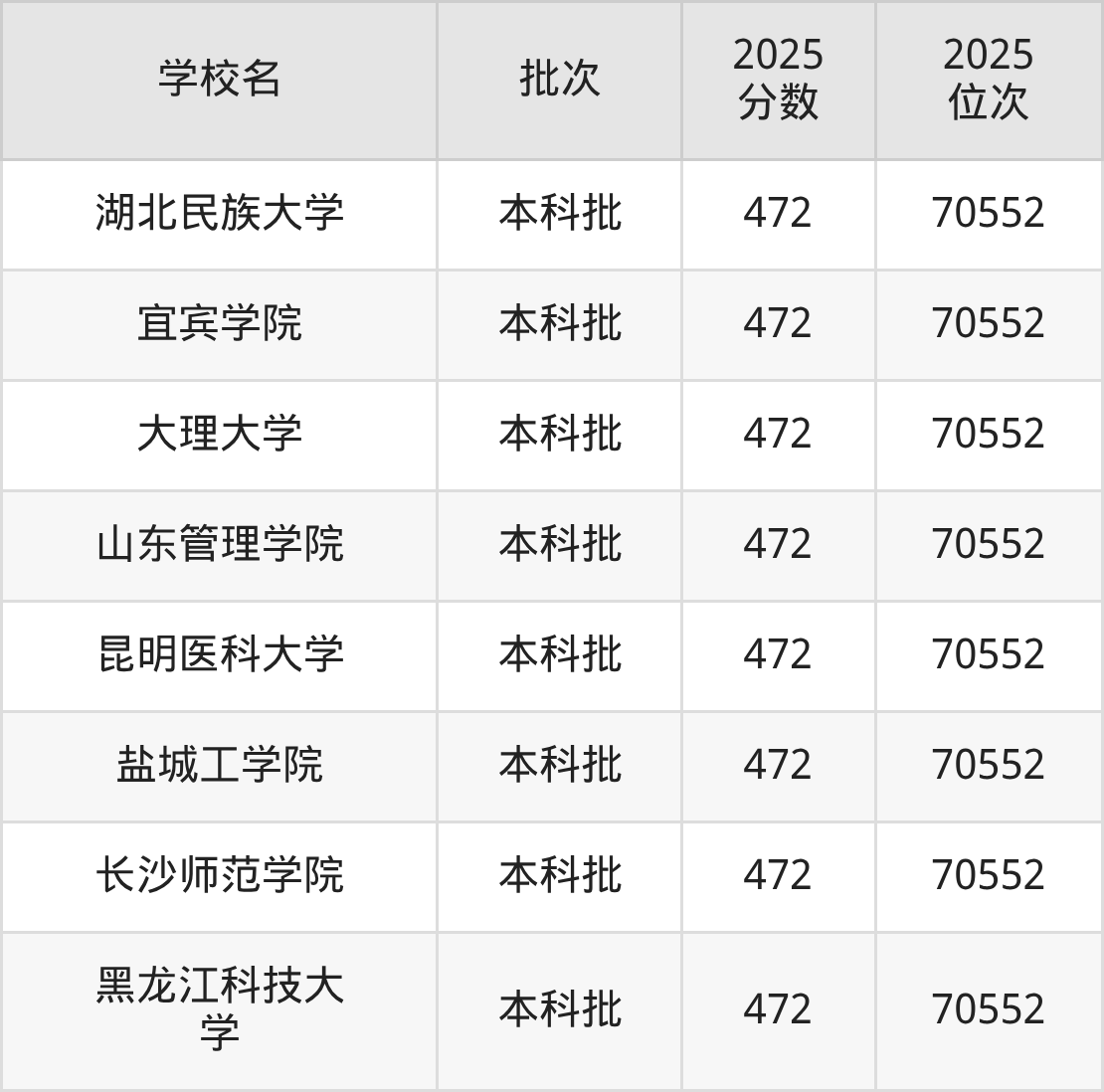 2025年辽宁高考物理类472分(70055名~70552名)能上的大学有黑龙江科技大学、长沙师范学院、盐城工学院、昆明医科大学等。