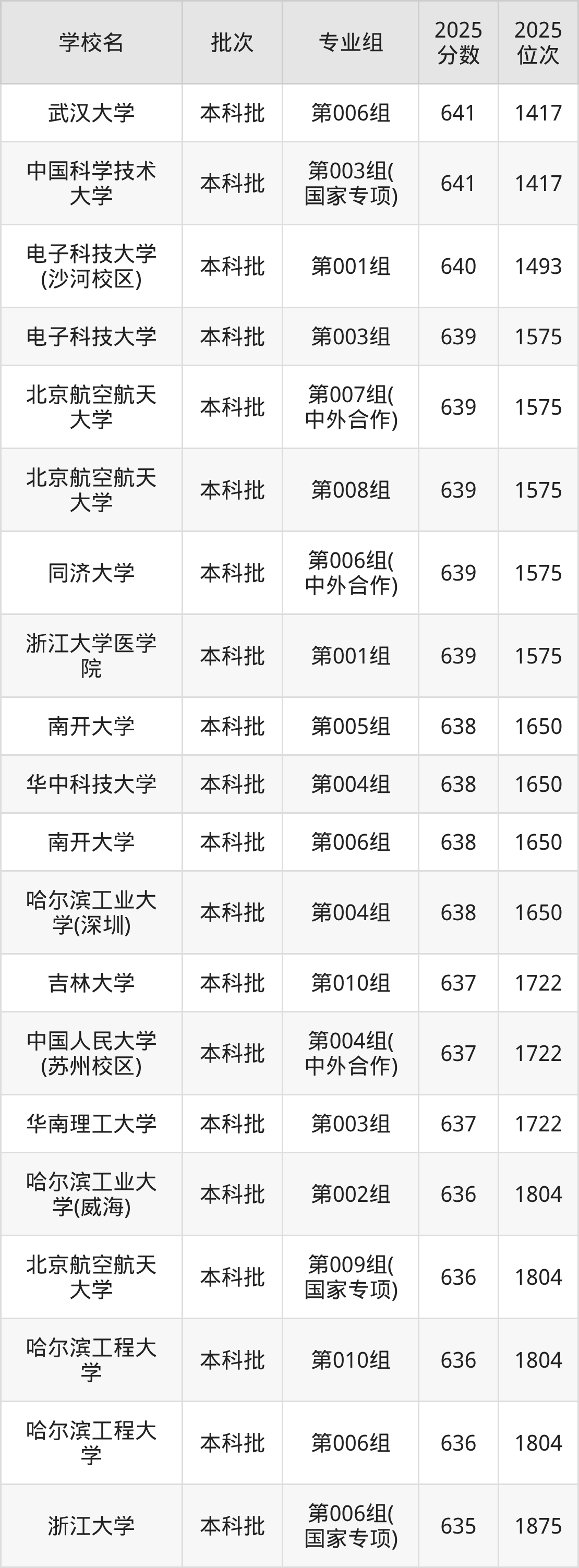 另外录取位次低于该区间(较稳妥)的有北京航空航天大学第002组(194名)、同济大学第001组(204名)等;录取位次高于该区间(可冲)的有浙江大学第003组(139名)、南京大学第001组(118名)等。