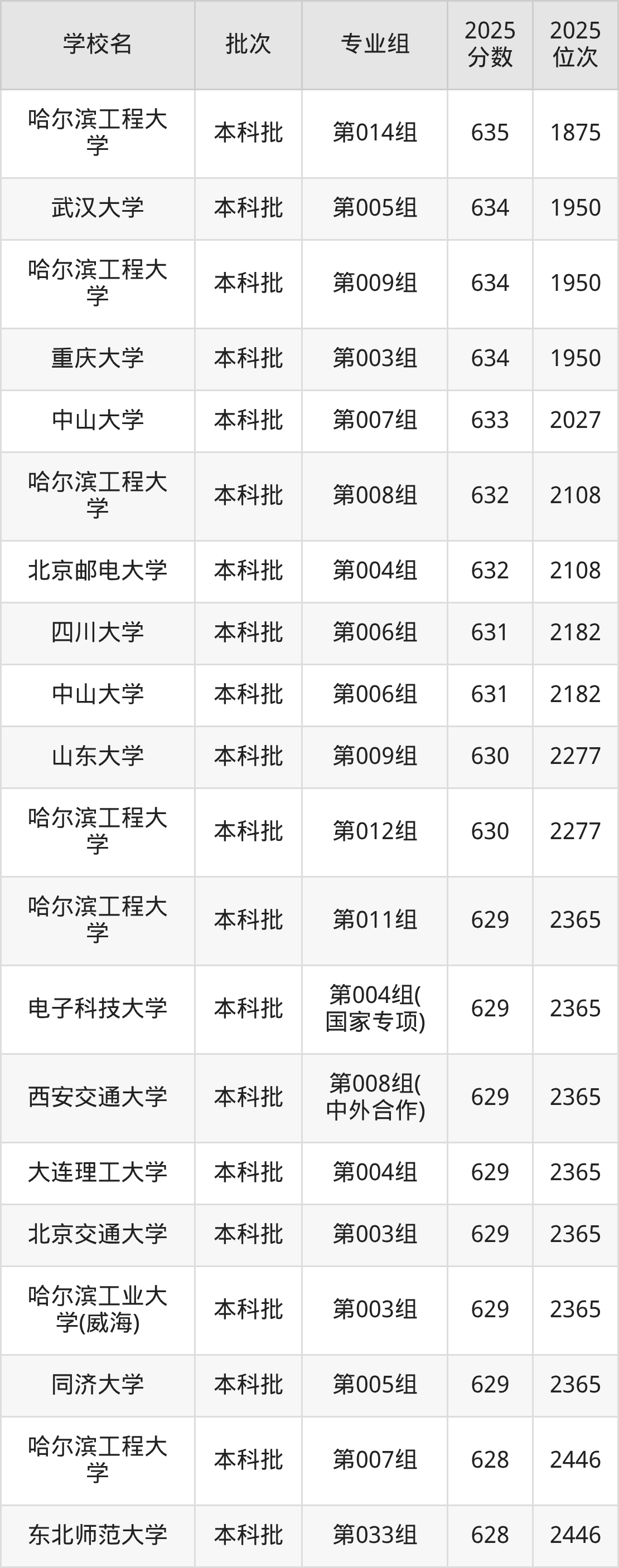 2025年黑龙江高考物理类634分(1876名~1950名)能上的大学有哈尔滨工程大学第009组、武汉大学第005组、重庆大学第003组。