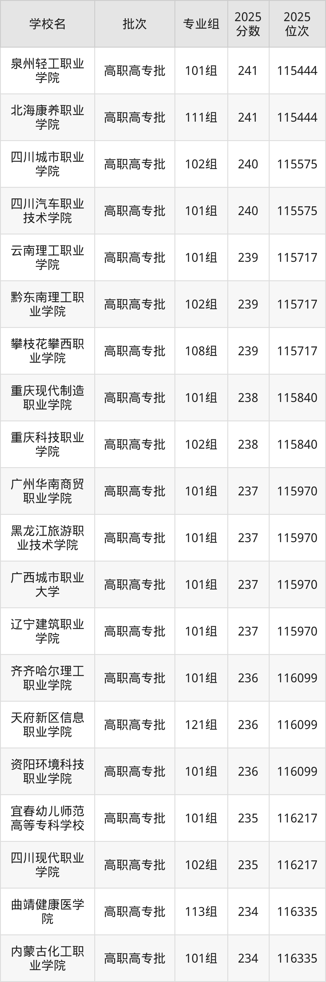 另外录取位次低于该区间(较稳妥)的有资阳环境科技职业学院101组(116099名)、天府新区信息职业学院121组(116099名)等;录取位次高于该区间(可冲)的有重庆科技职业学院102组(115840名)、重庆现代制造职业学院101组(115840名)等。