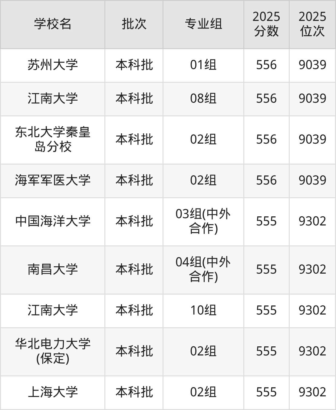 2025年上海高考556分(8825名~9039名)能上的大学有海军军医大学02组、东北大学秦皇岛分校02组、江南大学08组、苏州大学01组等。