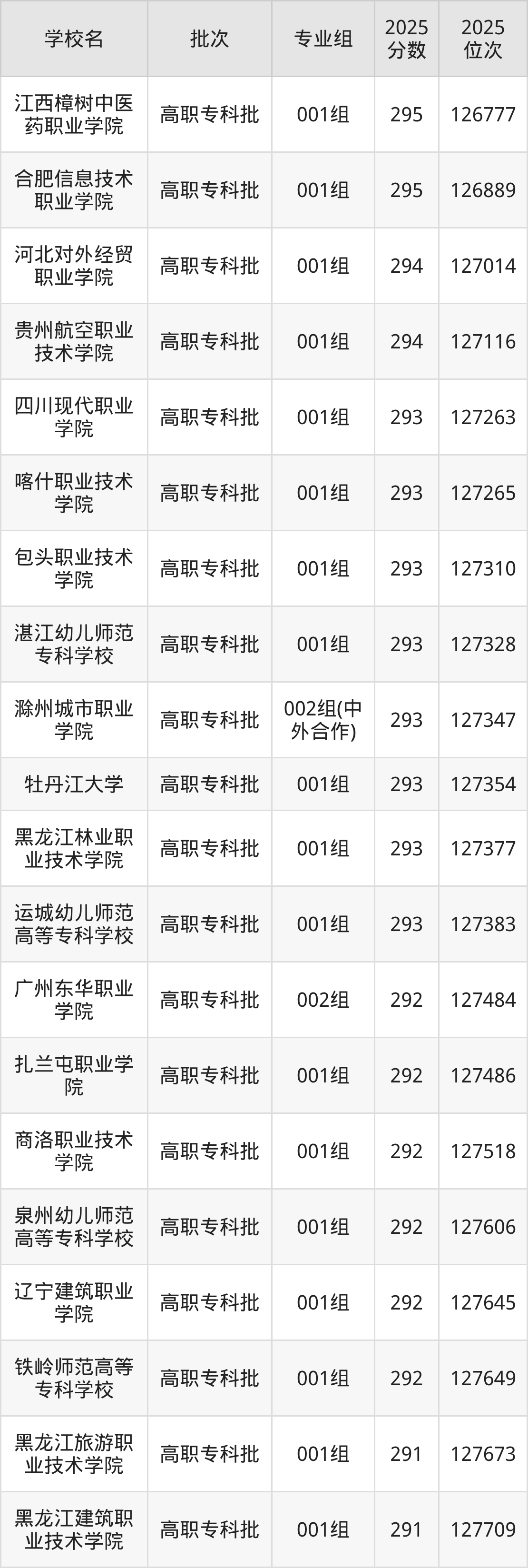 2025年安徽高考历史类293分(127205名~127452名)能上的大学有包头职业技术学院001组、黑龙江林业职业技术学院001组、喀什职业技术学院001组、牡丹江大学001组等。
