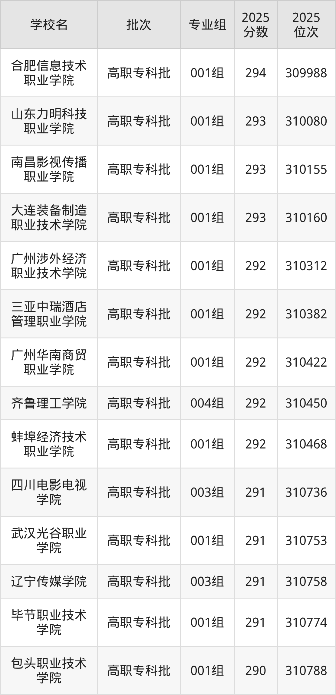 2025年安徽高考物理类293分(310060名~310300名)能上的大学有大连装备制造职业技术学院001组、南昌影视传播职业学院001组、山东力明科技职业学院001组。