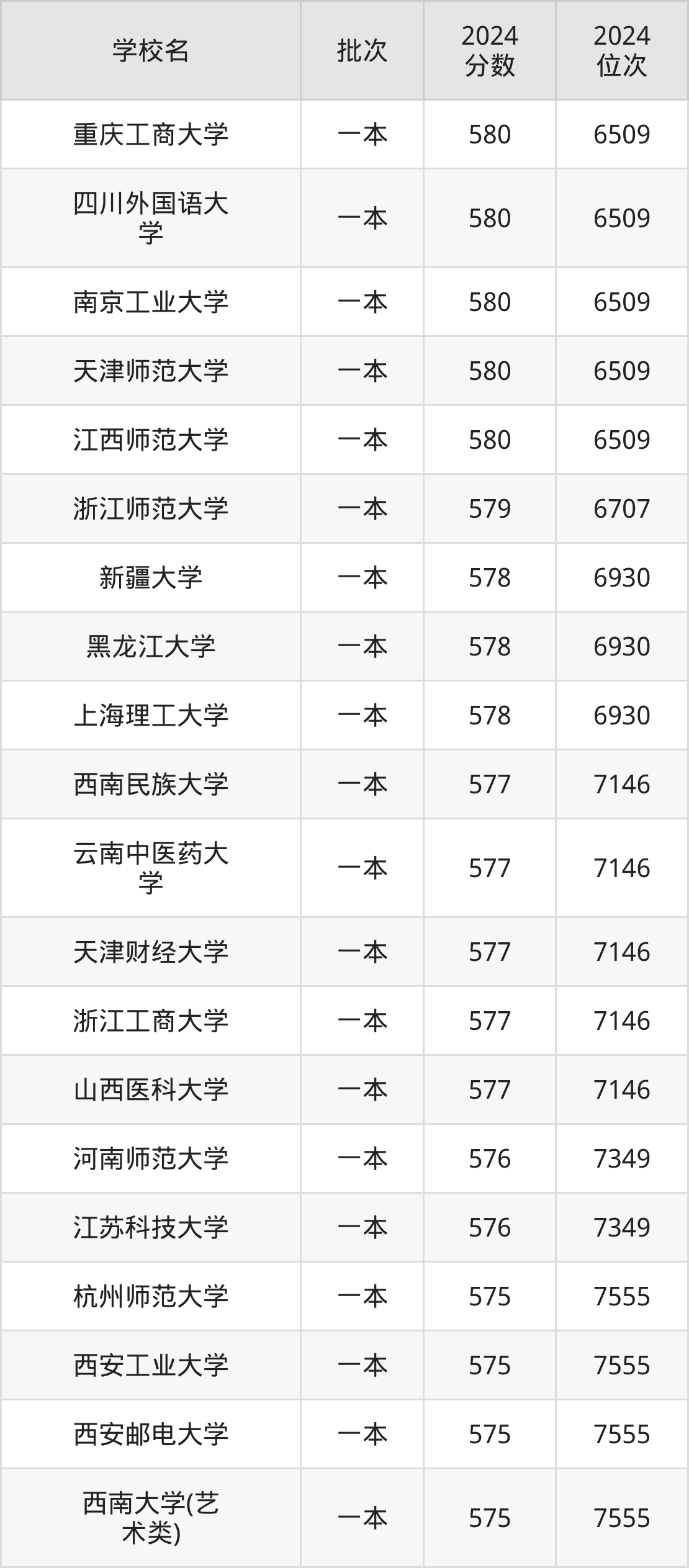 这些都是2025年高考文科6931名~7146名考生可以报考的大学,更多学校名单如下表所示: