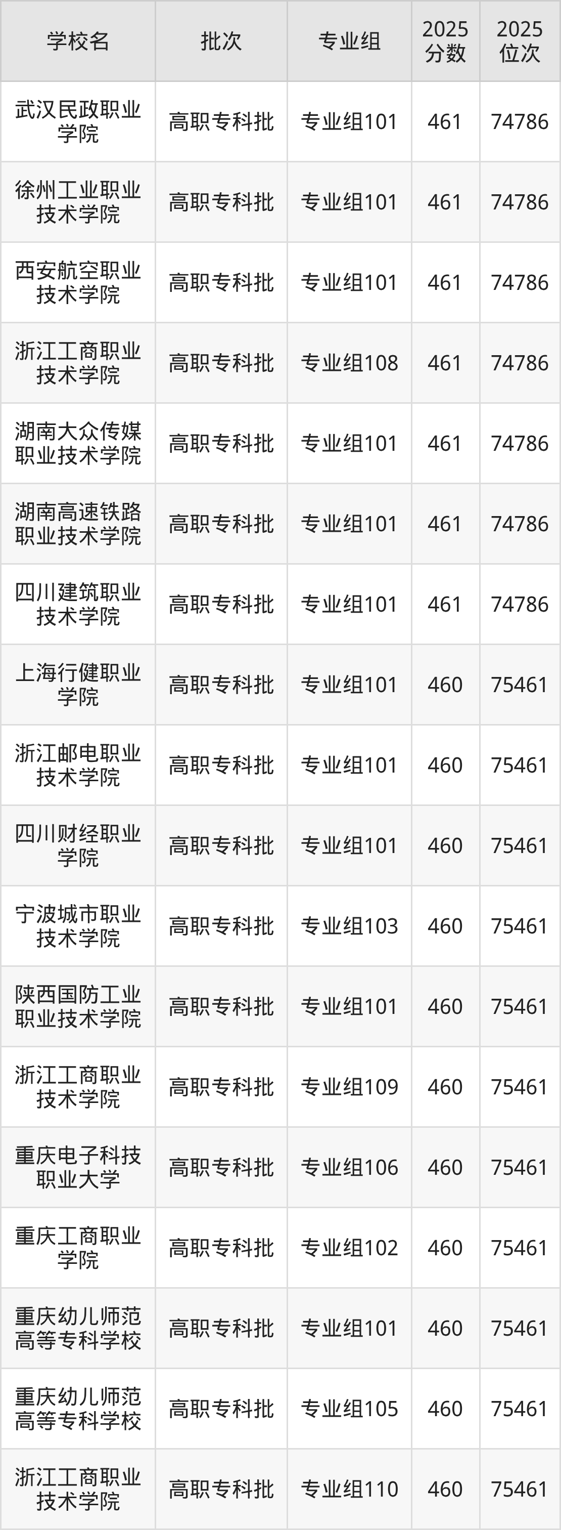 2025年四川高考历史类460分(74787名~75461名)能上的大学有浙江工商职业技术学院专业组110、重庆幼儿师范高等专科学校专业组105、重庆幼儿师范高等专科学校专业组101、重庆工商职业学院专业组102等。