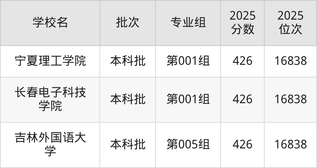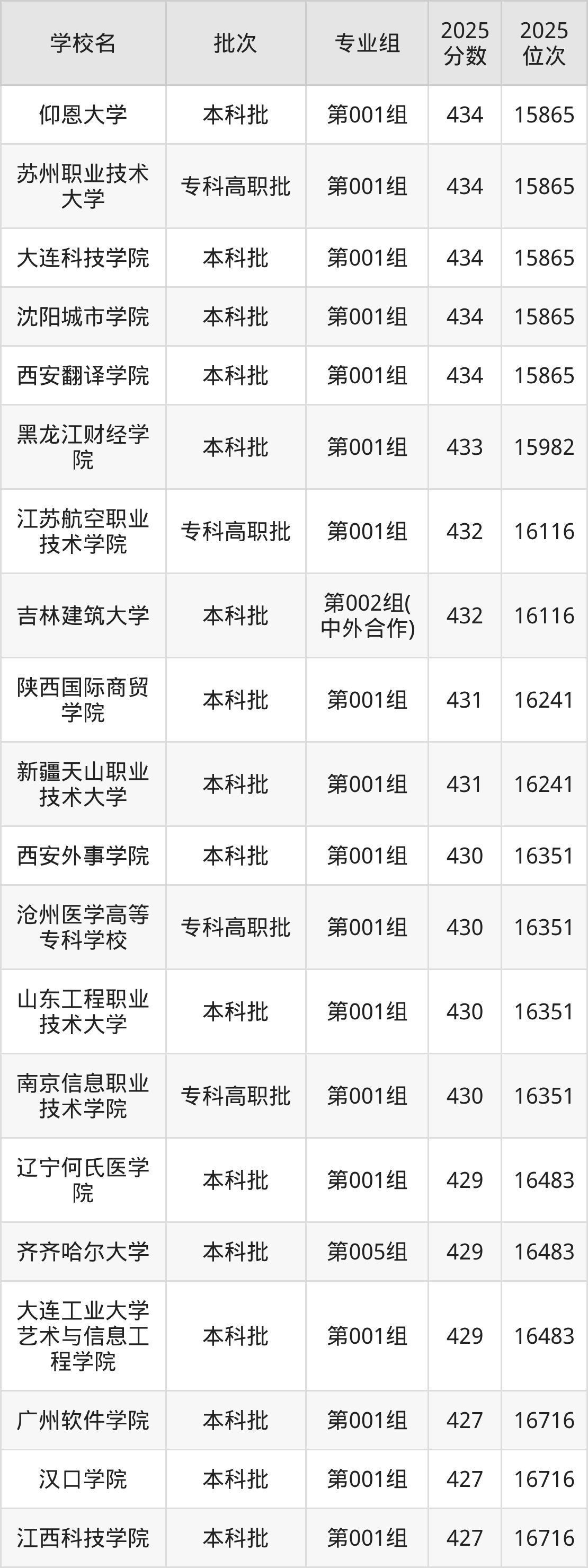 2025年吉林高考历史类430分(16242名~16351名)能上的大学有山东工程职业技术大学第001组、西安外事学院第001组、沧州医学高等专科学校第001组、南京信息职业技术学院第001组。