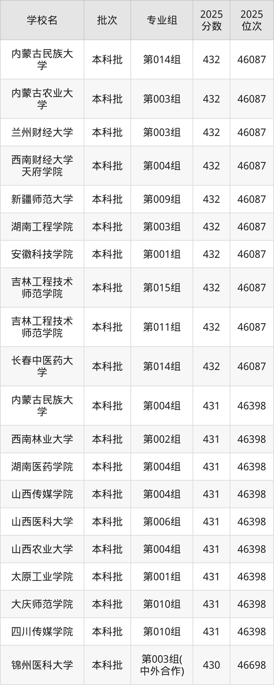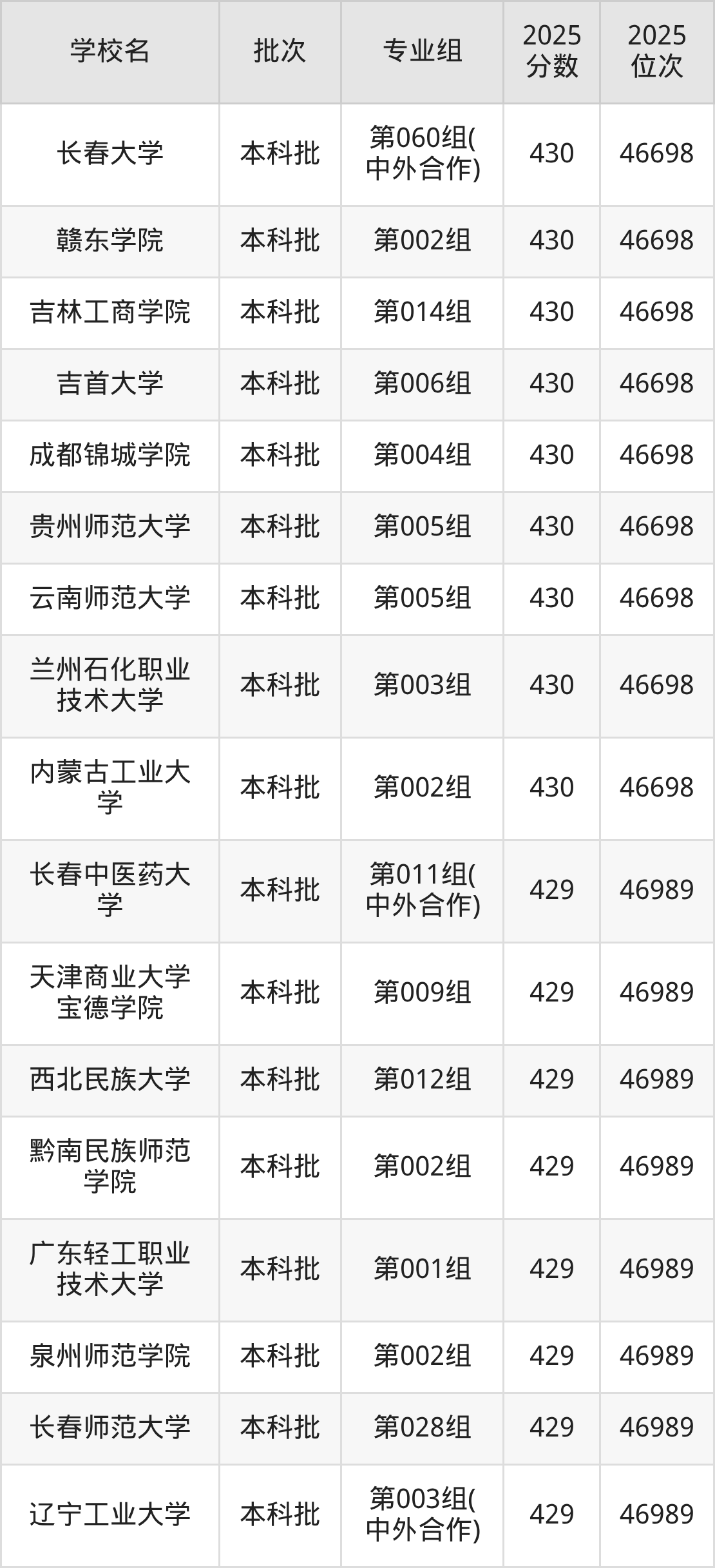 2025年吉林高考物理类430分(46399名~46698名)能上的大学有内蒙古工业大学第002组、锦州医科大学第003组(中外合作)、长春大学第060组(中外合作)、吉林工商学院第014组等。