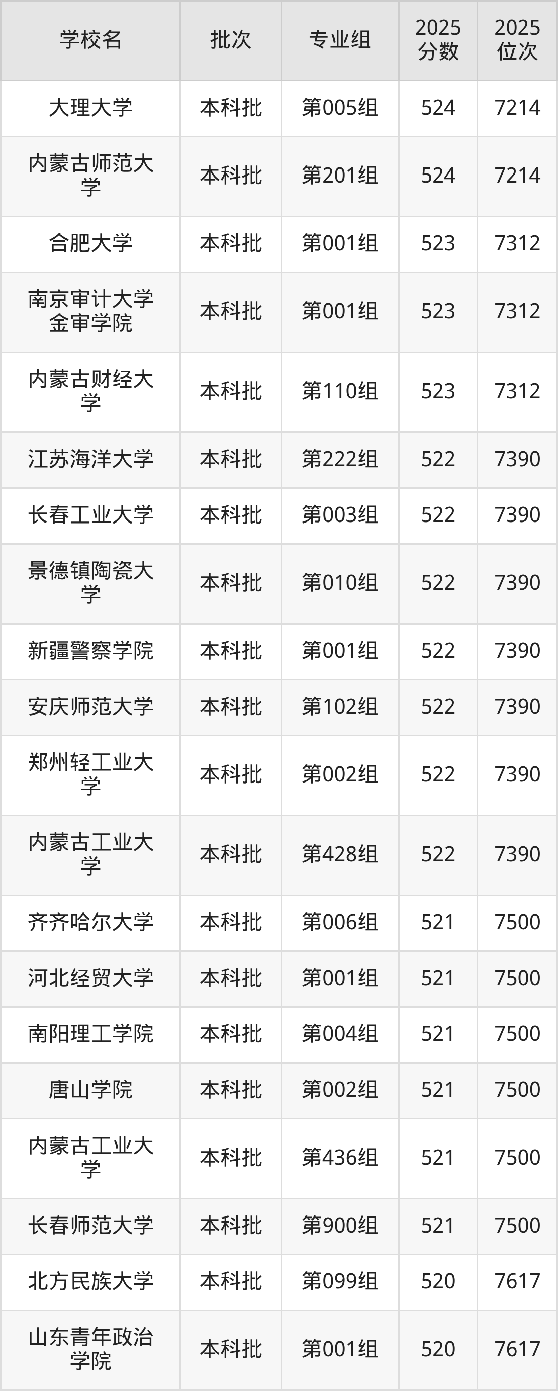 2025年内蒙古高考历史类523分(7215名~7312名)能上的大学有南京审计大学金审学院第001组、内蒙古财经大学第110组、合肥大学第001组。