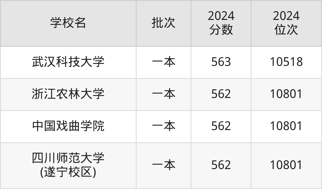 这些都是2025年高考文科10251名~10518名考生可以报考的大学,更多学校名单如下表所示: