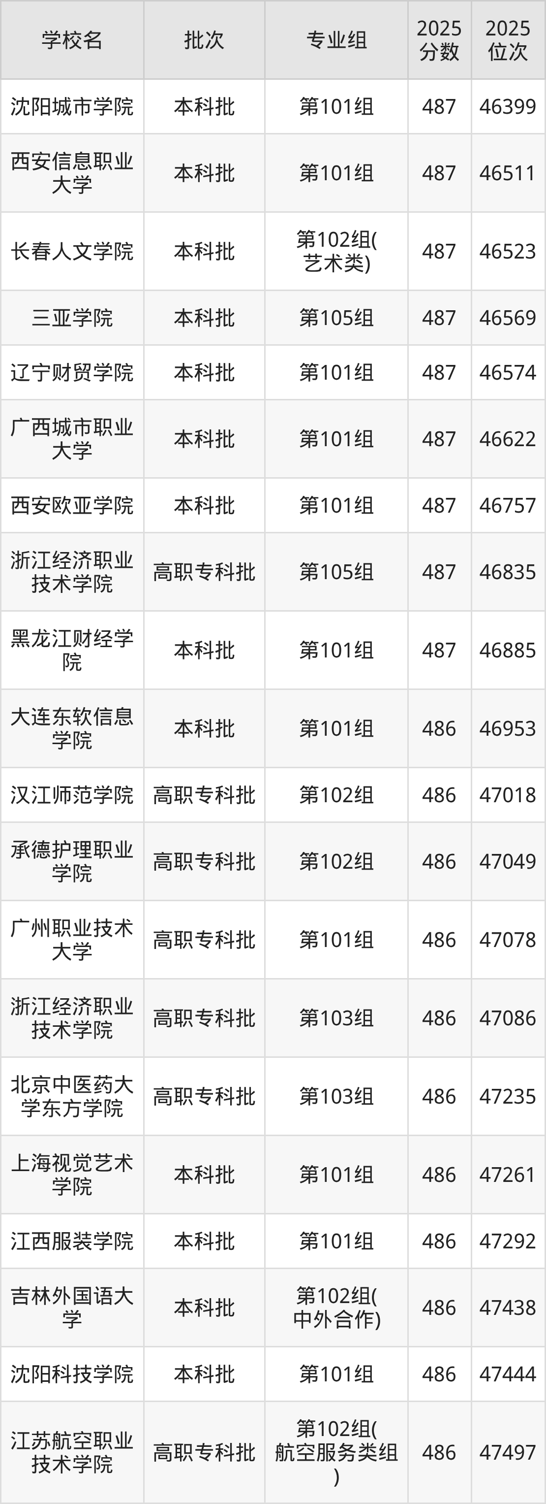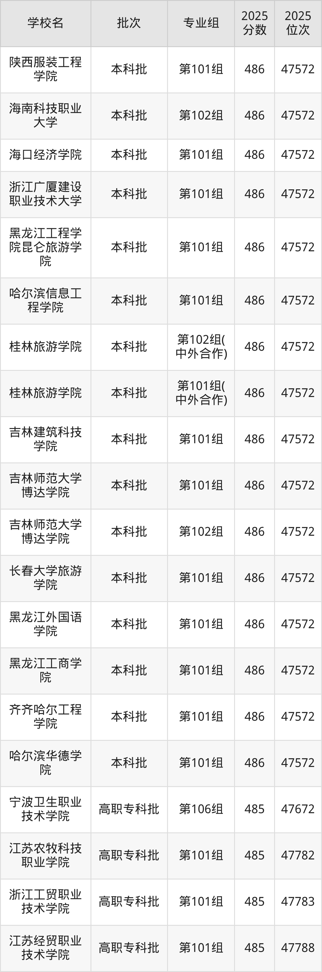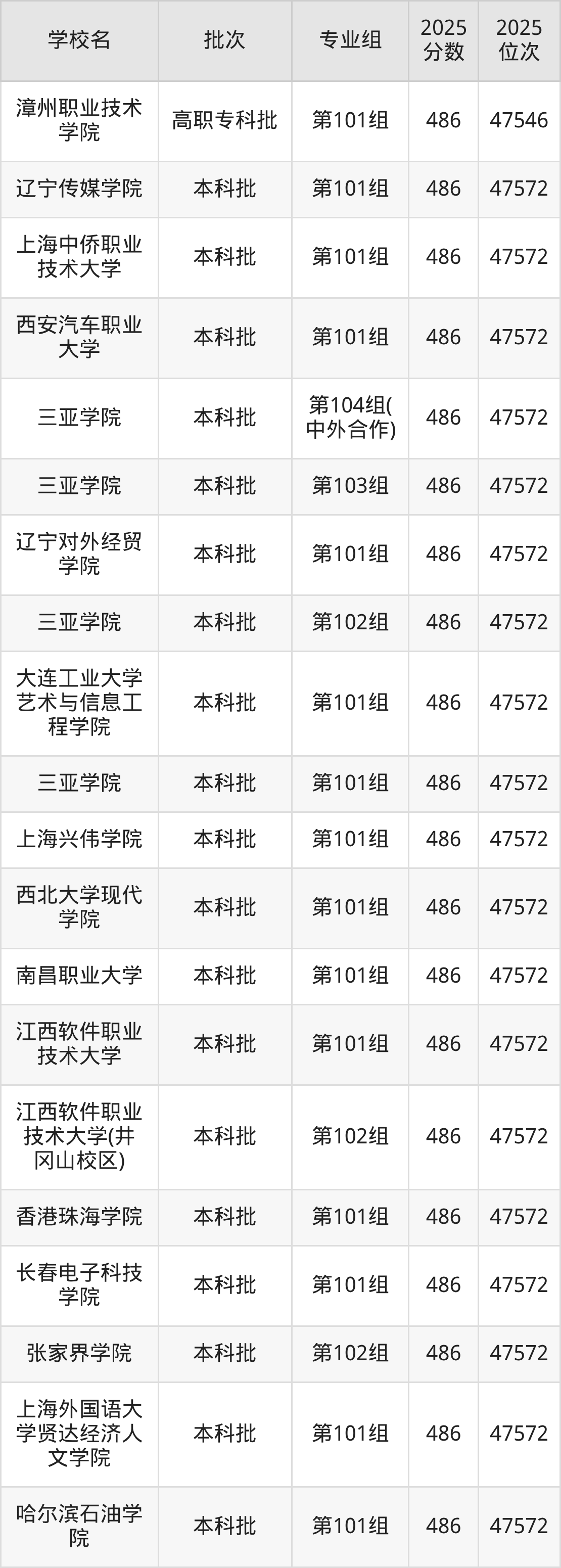 2025年江西高考历史类486分(46888名~47572名)能上的大学有辽宁对外经贸学院第101组、吉林外国语大学第102组(中外合作)、大连东软信息学院第101组、大连工业大学艺术与信息工程学院第101组等。