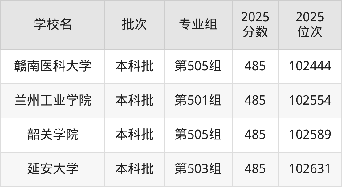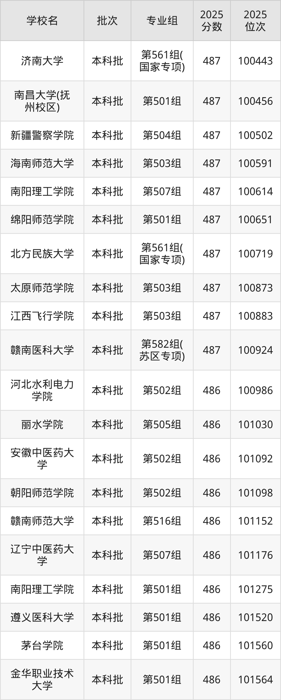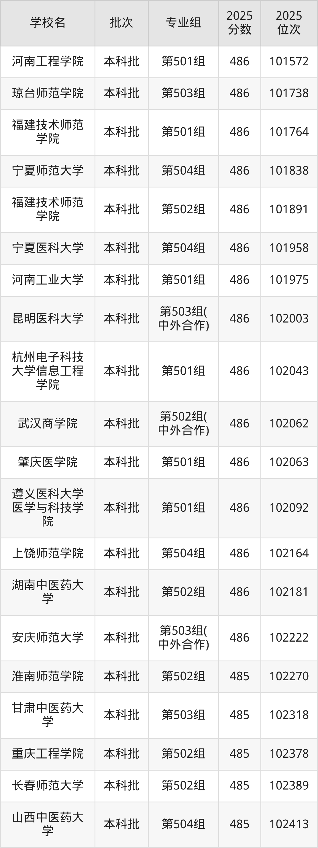 2025年江西高考物理类486分(100929名~102222名)能上的大学有辽宁中医药大学第507组、丽水学院第505组、安徽中医药大学第502组、安庆师范大学第503组(中外合作)等。