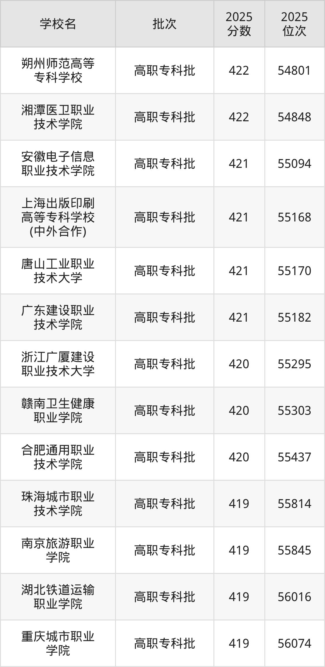 2025年贵州高考历史类420分(55275名~55695名)能上的大学有浙江广厦建设职业技术大学、合肥通用职业技术学院、赣南卫生健康职业学院。
