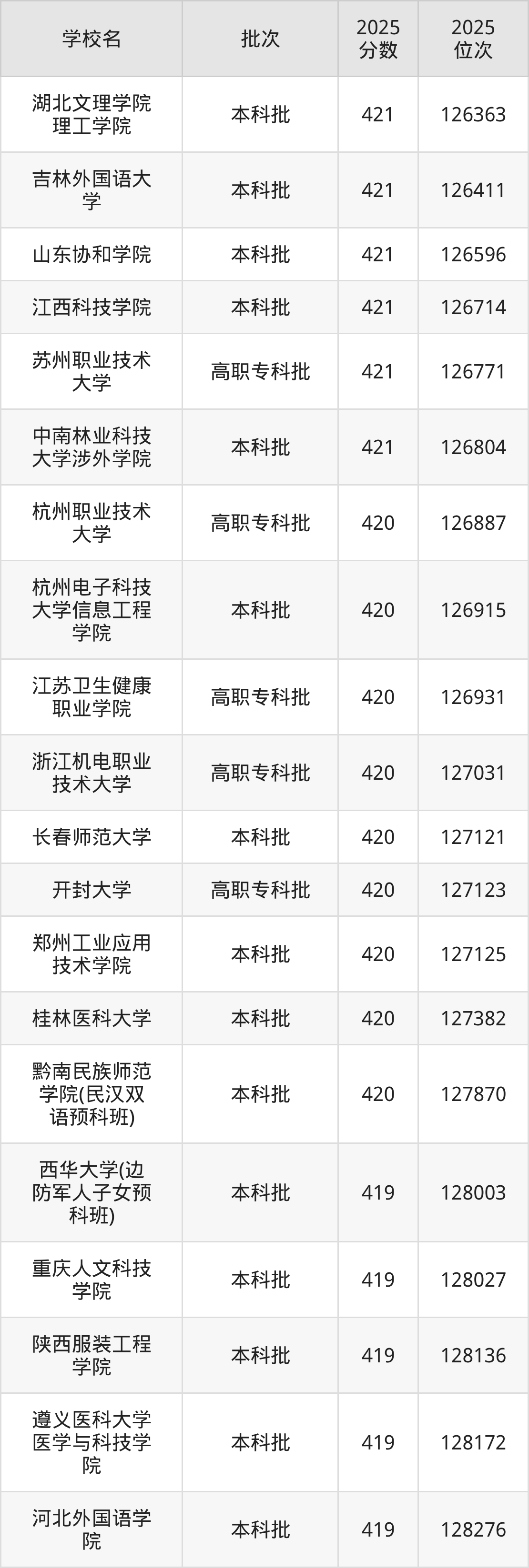 2025年贵州高考物理类420分(126812名~127874名)能上的大学有桂林医科大学、长春师范大学、杭州职业技术大学、杭州电子科技大学信息工程学院等。