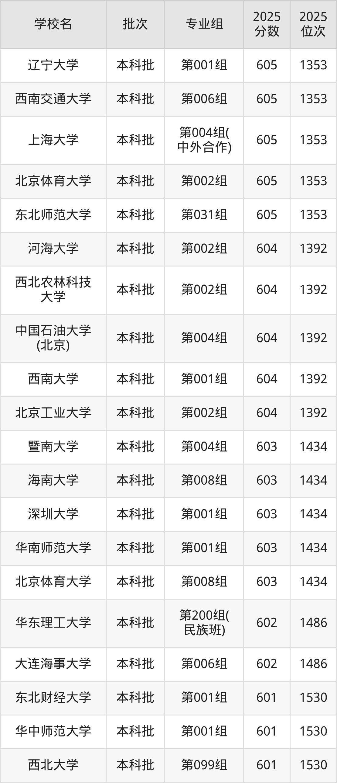 2025年内蒙古高考历史类605分(1304名~1353名)能上的大学有辽宁大学第001组、东北师范大学第031组、北京体育大学第002组、上海大学第004组(中外合作)等。