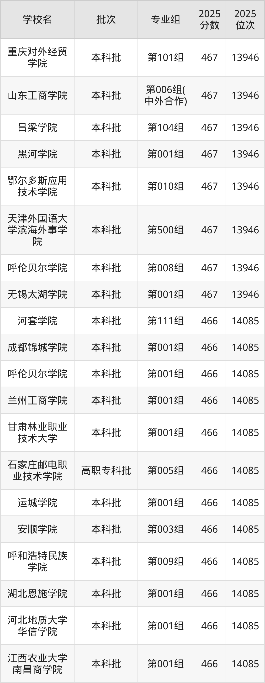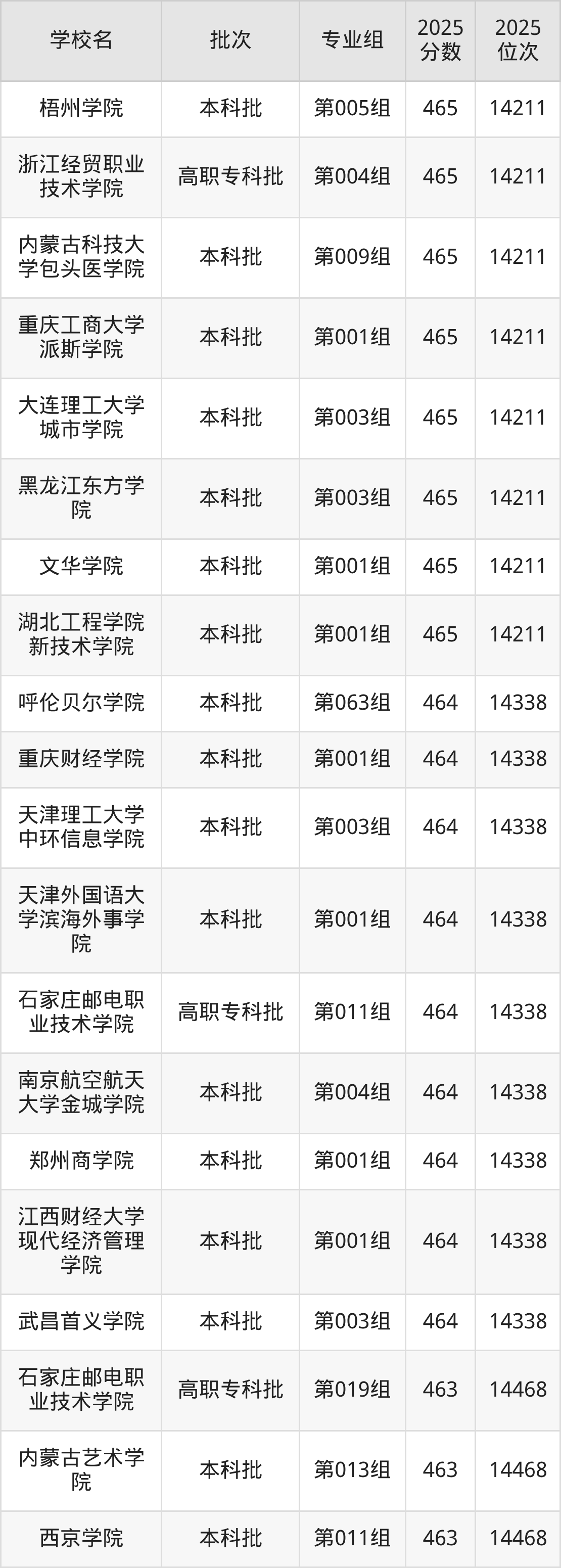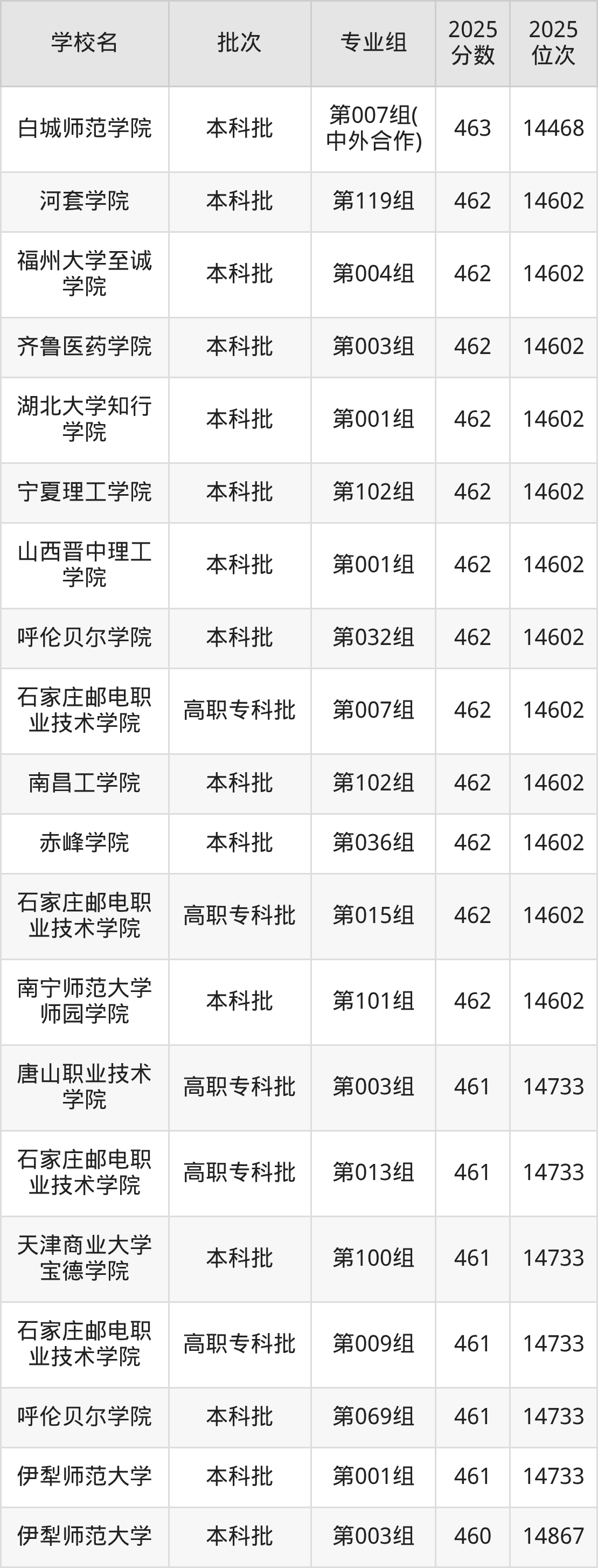 2025年内蒙古高考历史类463分(14339名~14468名)能上的大学有西京学院第011组、白城师范学院第007组(中外合作)、内蒙古艺术学院第013组、石家庄邮电职业技术学院第019组。