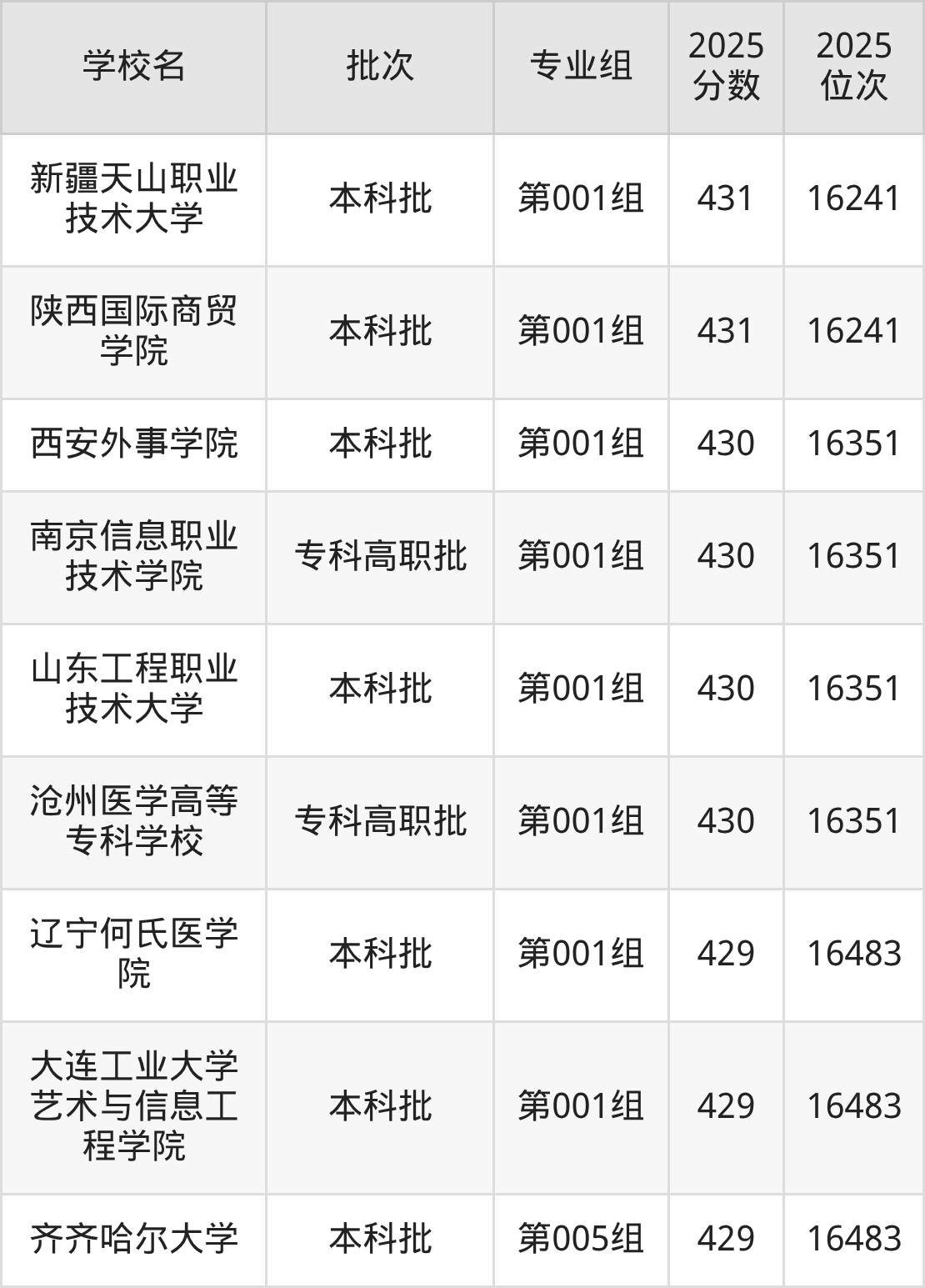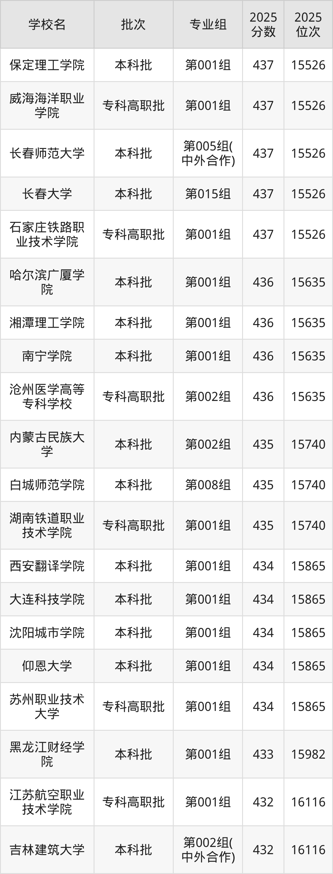 2025年吉林高考历史类432分(15983名~16116名)能上的大学有吉林建筑大学第002组(中外合作)、江苏航空职业技术学院第001组。