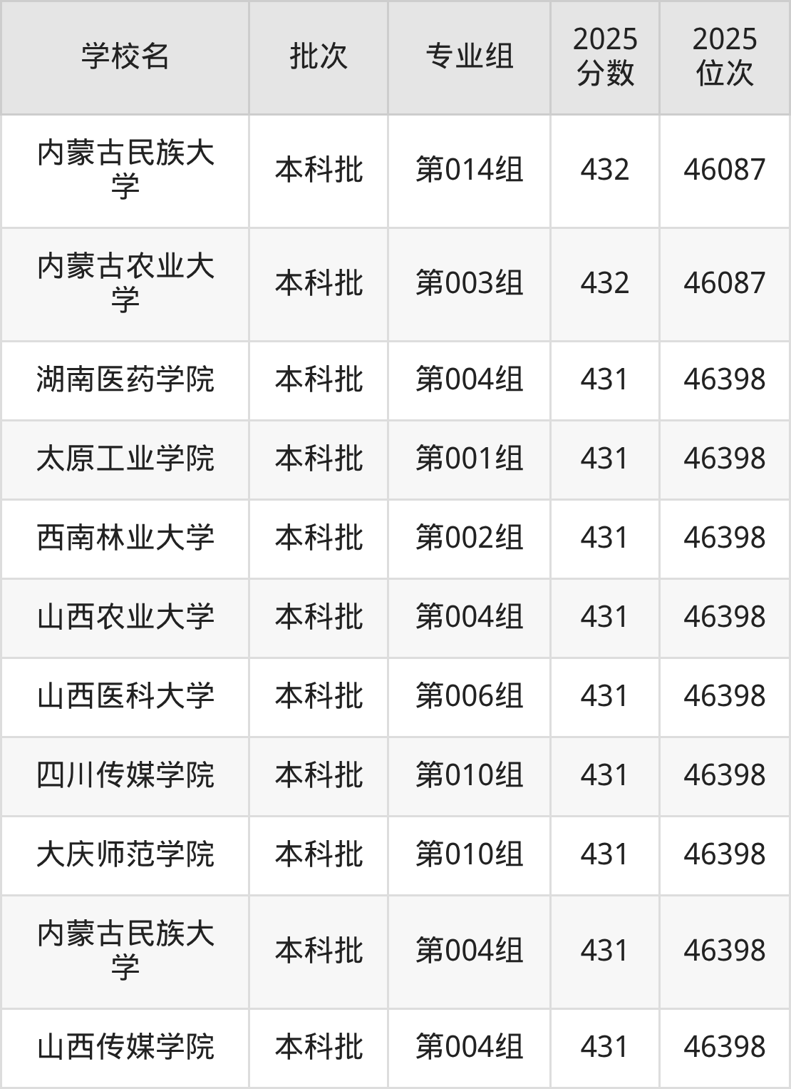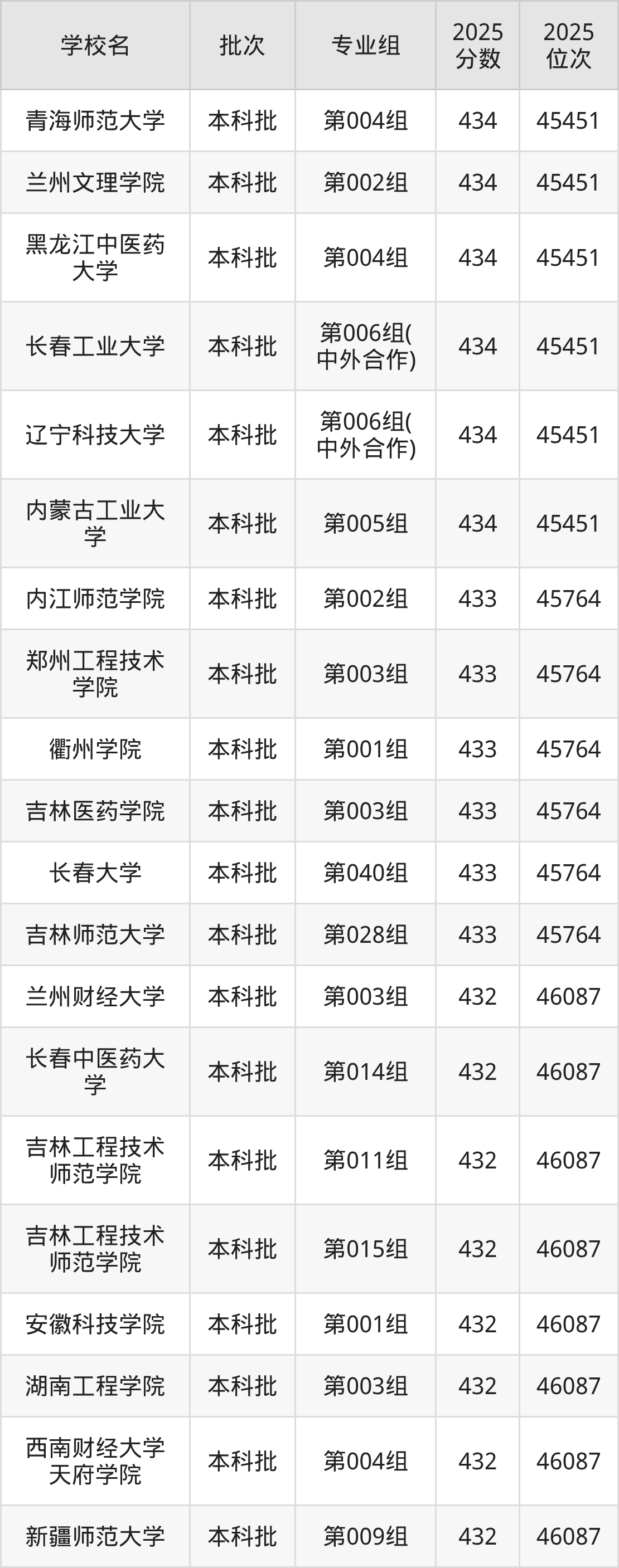2025年吉林高考物理类432分(45765名~46087名)能上的大学有内蒙古农业大学第003组、内蒙古民族大学第014组、长春中医药大学第014组、吉林工程技术师范学院第011组等。