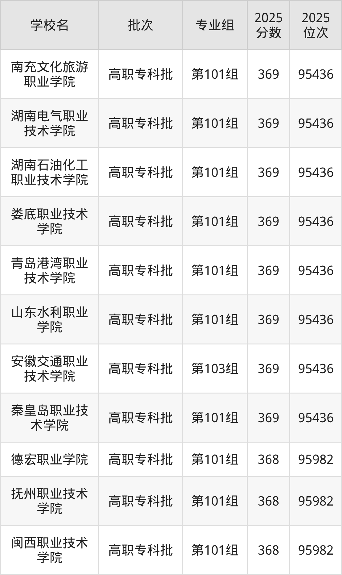 2025年湖南高考历史类368分(95437名~95982名)能上的大学有闽西职业技术学院第101组、抚州职业技术学院第101组、德宏职业学院第101组。