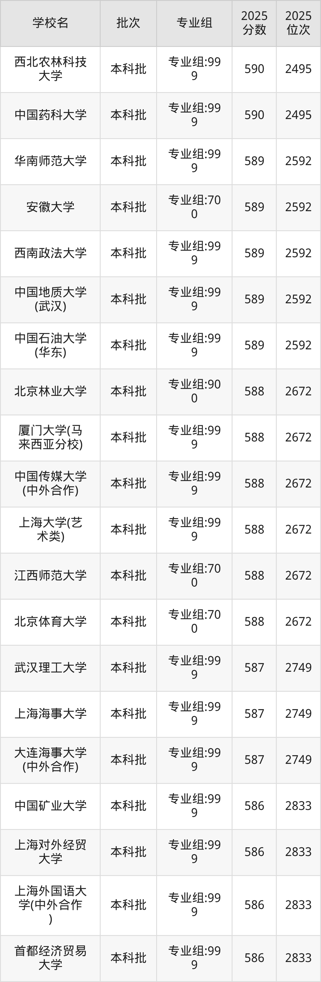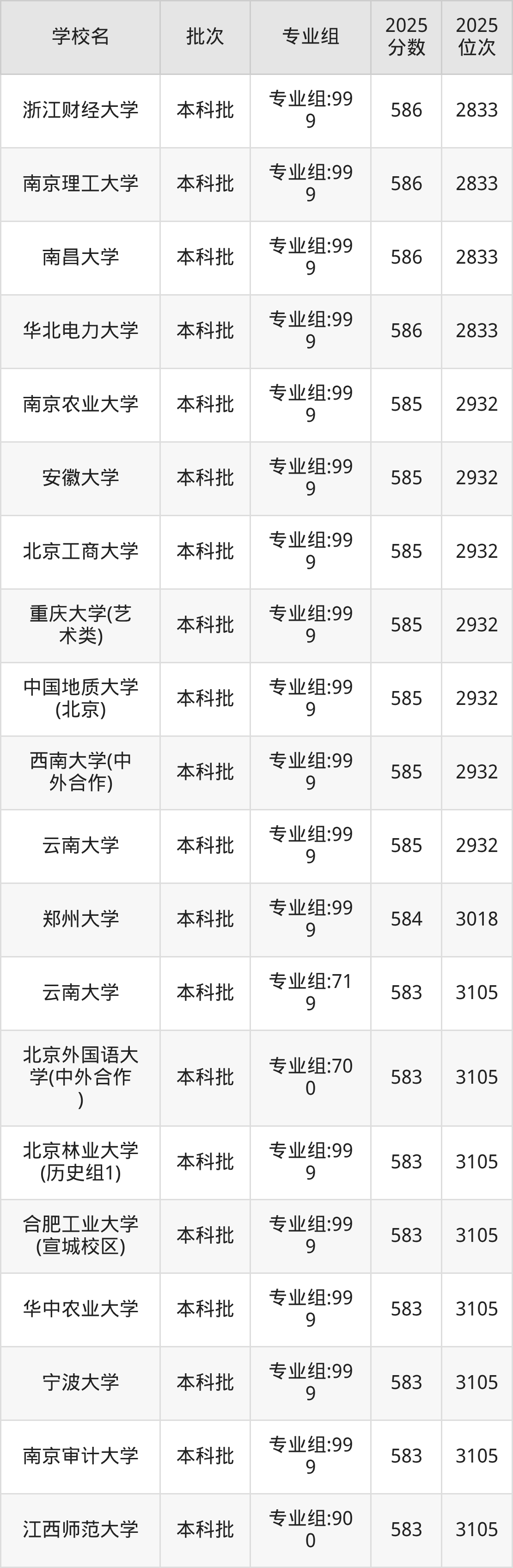 2025年福建高考历史类586分(2750名~2833名)能上的大学有华北电力大学专业组:999、南昌大学专业组:999、南京理工大学专业组:999、上海对外经贸大学专业组:999等。
