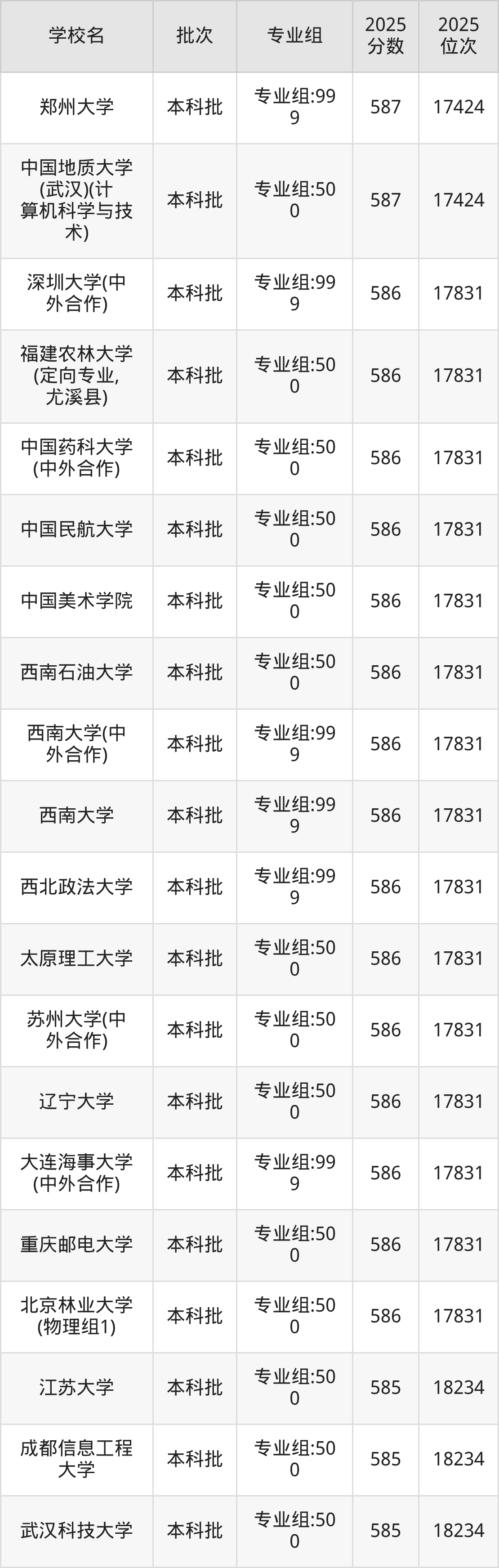 2025年福建高考物理类586分(17425名~17831名)能上的大学有福建农林大学(定向专业,尤溪县)专业组:500、北京林业大学(物理组1)专业组:500、重庆邮电大学专业组:500、大连海事大学(中外合作)专业组:999等。