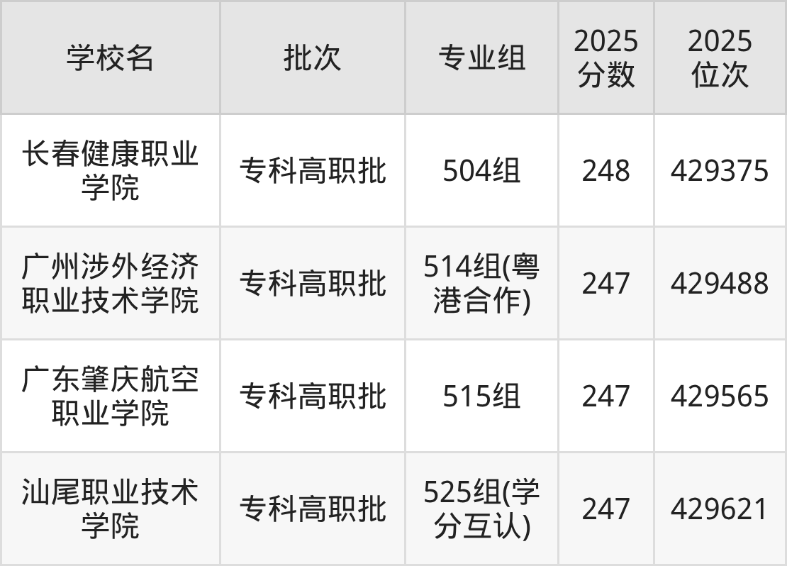 2025年广东高考历史类246分(281668名~281942名)录取位次低于该区间(较稳妥)的有广东碧桂园职业学院501组(281972名)、广东肇庆航空职业学院501组(283478名)等;录取位次高于该区间(可冲)的有广州涉外经济职业技术学院513组(粤港合作)(279217名)、广东文理职业学院508组(学分互认)(277008名)等。