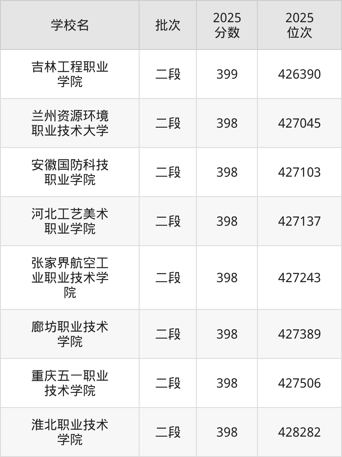 2025年山东高考398分(426430名~428410名)能上的大学有廊坊职业技术学院、重庆五一职业技术学院、兰州资源环境职业技术大学、张家界航空工业职业技术学院等。
