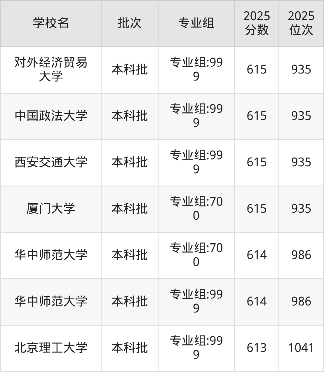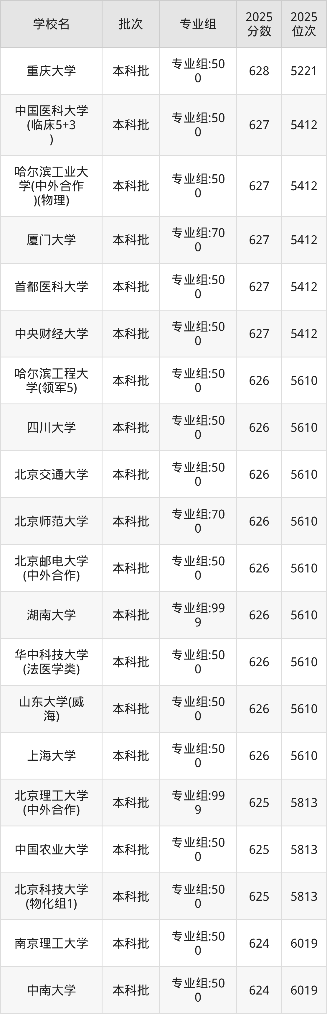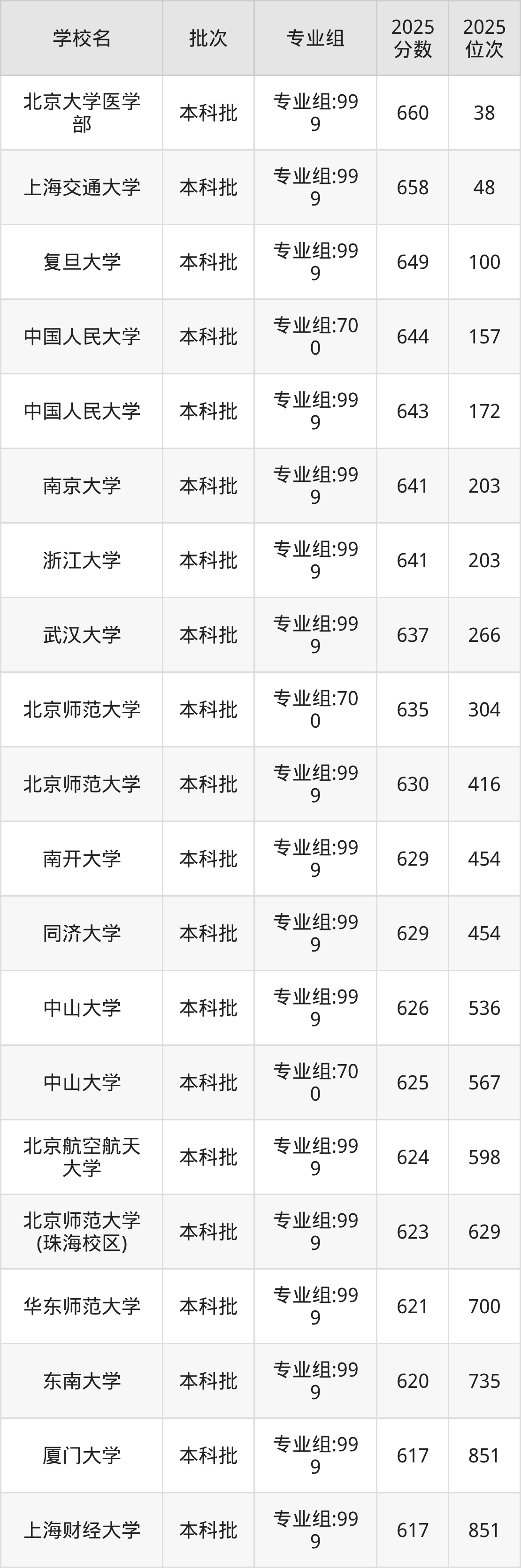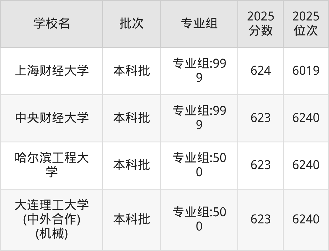 另外录取位次低于该区间(较稳妥)的有中南大学专业组:500(6019名)、上海财经大学专业组:999(6019名)等;录取位次高于该区间(可冲)的有北京交通大学专业组:500(5610名)、北京师范大学专业组:700(5610名)等。