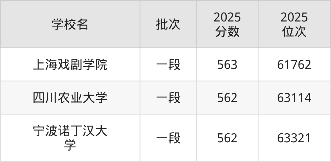 这些都是2026年高考61735名~63106名考生可以报考的大学,更多学校名单如下表所示:
