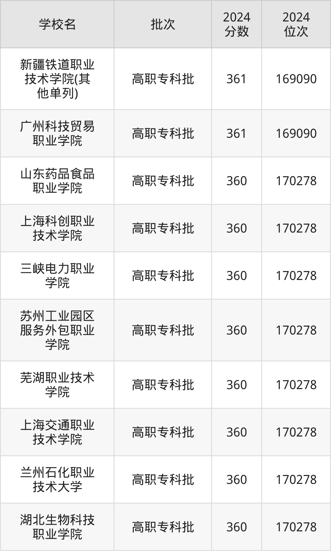 2024年河南高考文科360分(169091名~170278名)能上的大学有湖北生物科技职业学院、兰州石化职业技术大学、上海交通职业技术学院、山东药品食品职业学院等。