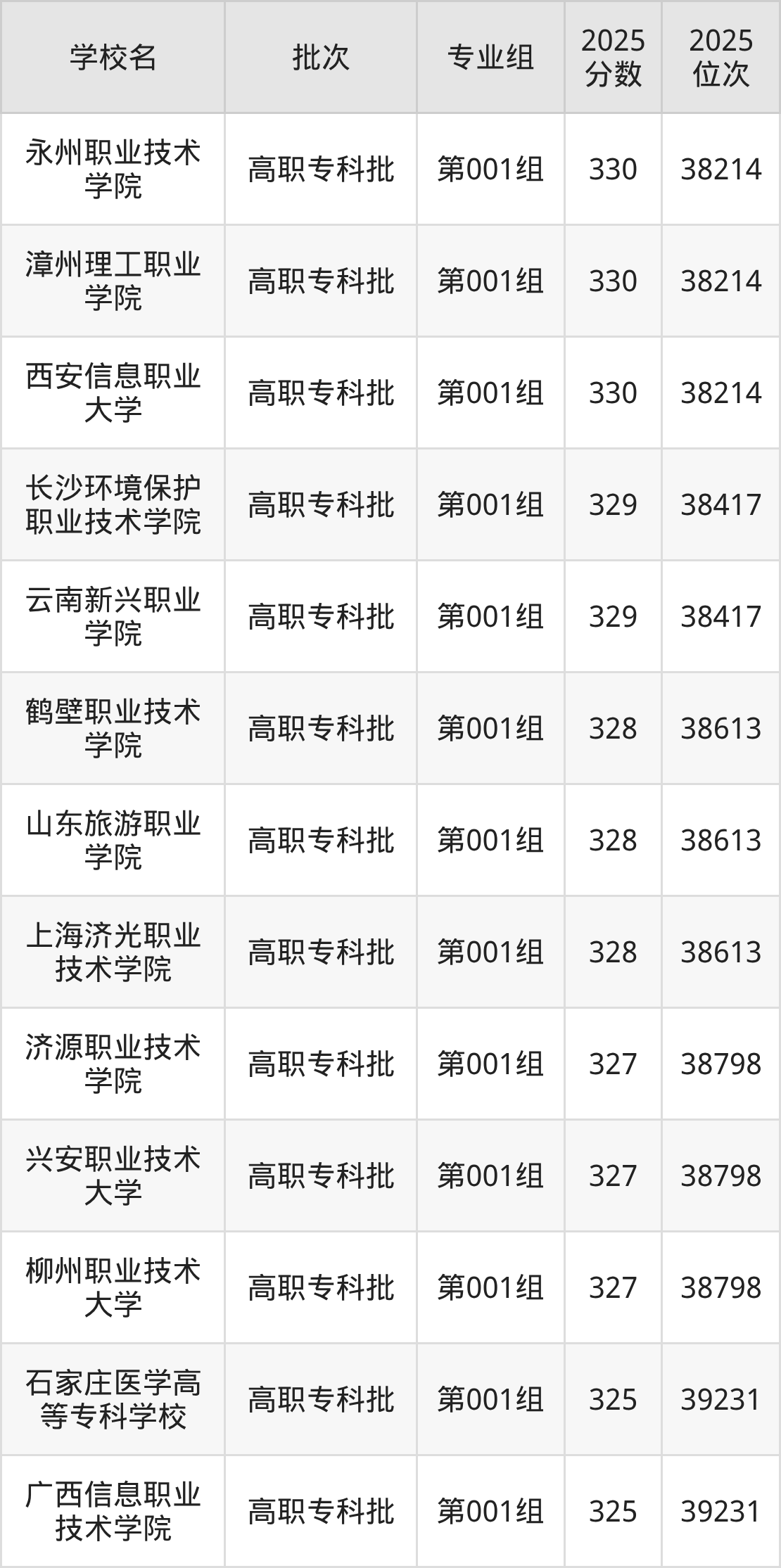 2025年黑龙江高考历史类327分(38614名~38798名)能上的大学有柳州职业技术大学第001组、兴安职业技术大学第001组、济源职业技术学院第001组。