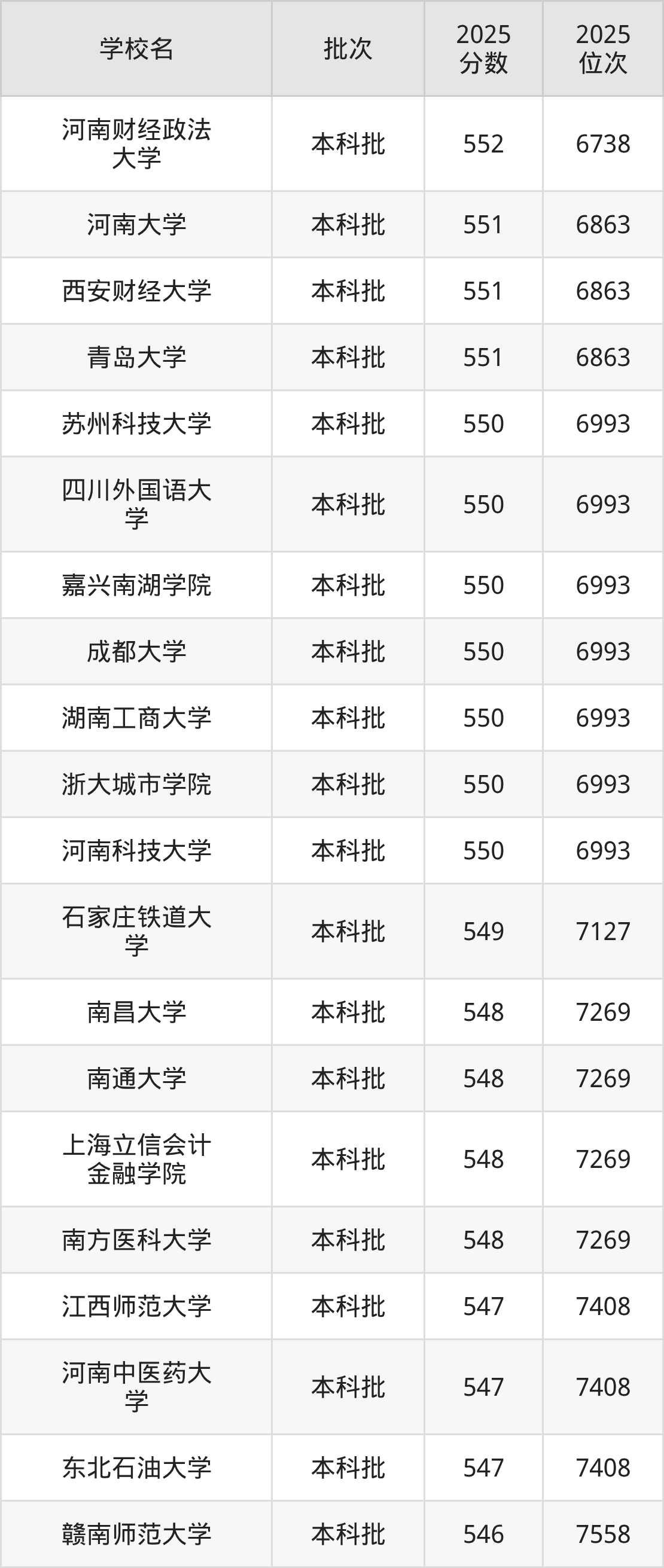 2025年辽宁高考历史类548分(7128名~7269名)能上的大学有南通大学、南方医科大学、上海立信会计金融学院、南昌大学。