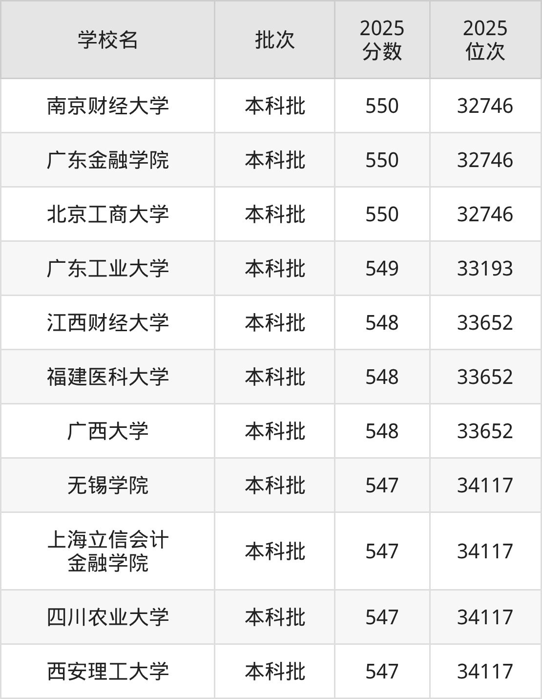 2025年辽宁高考物理类548分(33194名~33652名)能上的大学有江西财经大学、福建医科大学、广西大学。