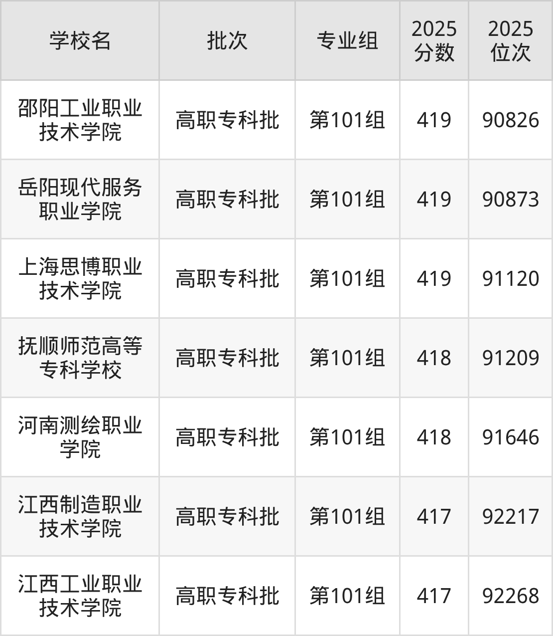2025年江西高考历史类418分(91187名~91846名)能上的大学有抚顺师范高等专科学校第101组、河南测绘职业学院第101组。