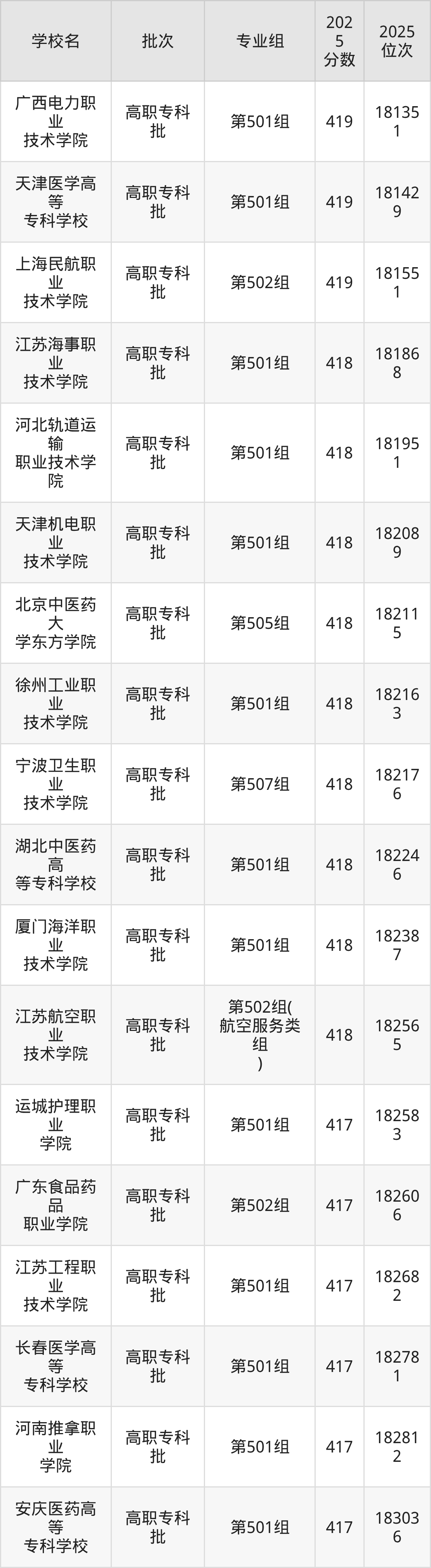 2025年江西高考物理类418分(181684名~182573名)能上的大学有北京中医药大学东方学院第505组、湖北中医药高等专科学校第501组、江苏航空职业技术学院第502组(航空服务类组)、天津机电职业技术学院第501组等。