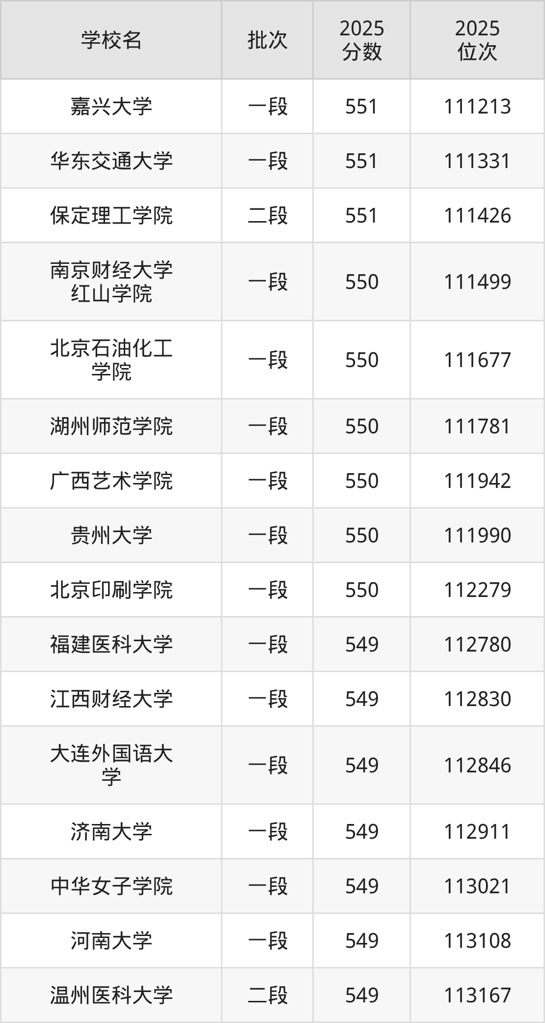 2025年浙江高考550分(111483名~112672名)能上的大学有北京印刷学院、广西艺术学院、南京财经大学红山学院、贵州大学等。