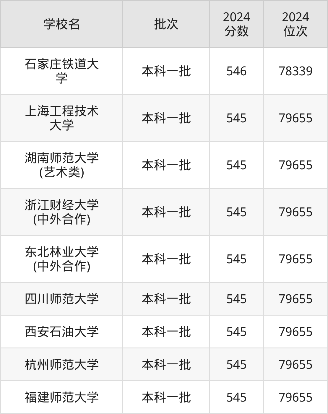 2024年河南高考文科545分(14154名~14531名)能上的大学有石家庄铁道大学、湖州师范学院。