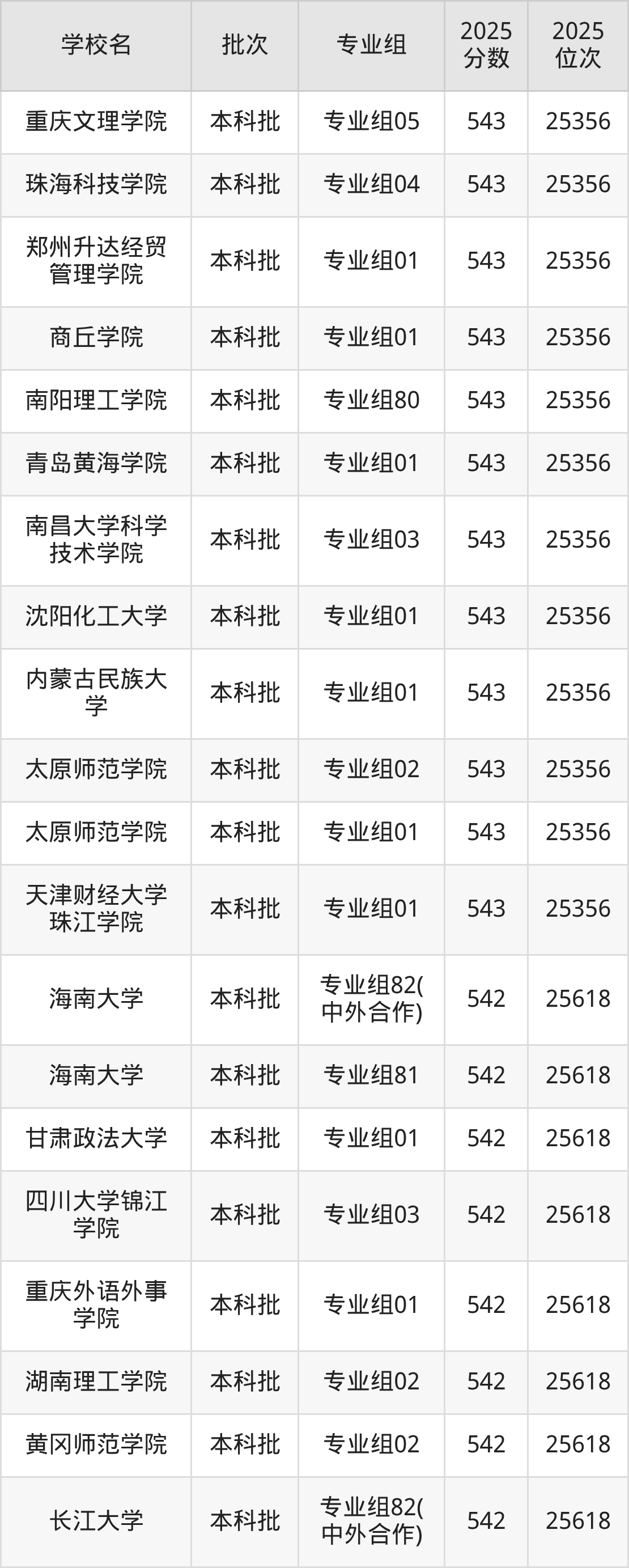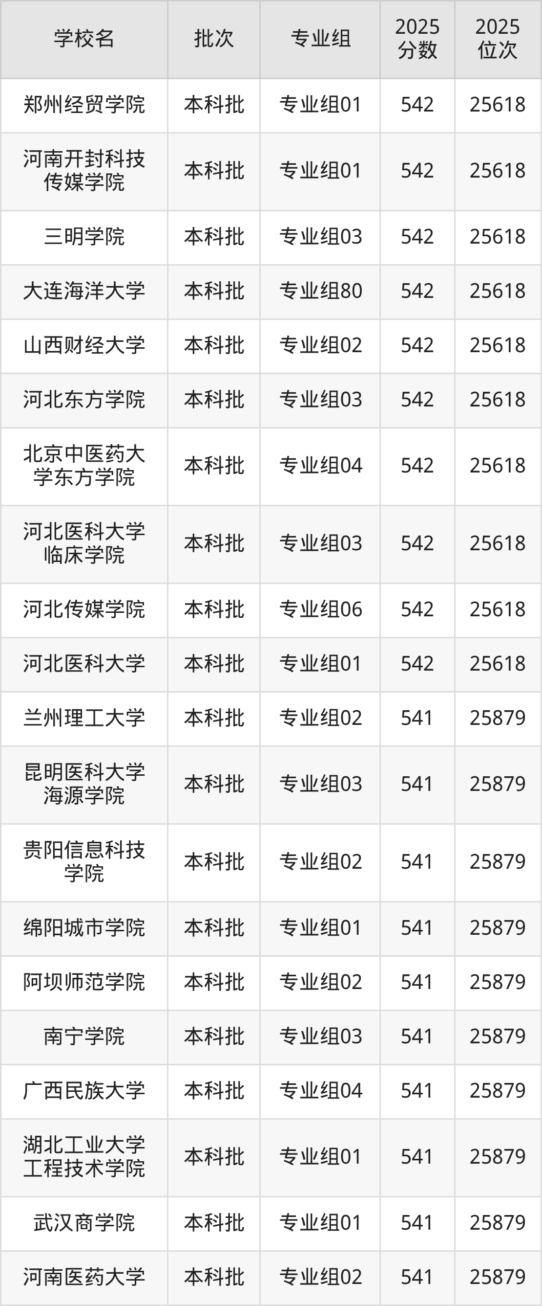 2025年海南高考542分(25357名~25618名)能上的大学有河北医科大学专业组01、河北传媒学院专业组06、河北医科大学临床学院专业组03、北京中医药大学东方学院专业组04等。