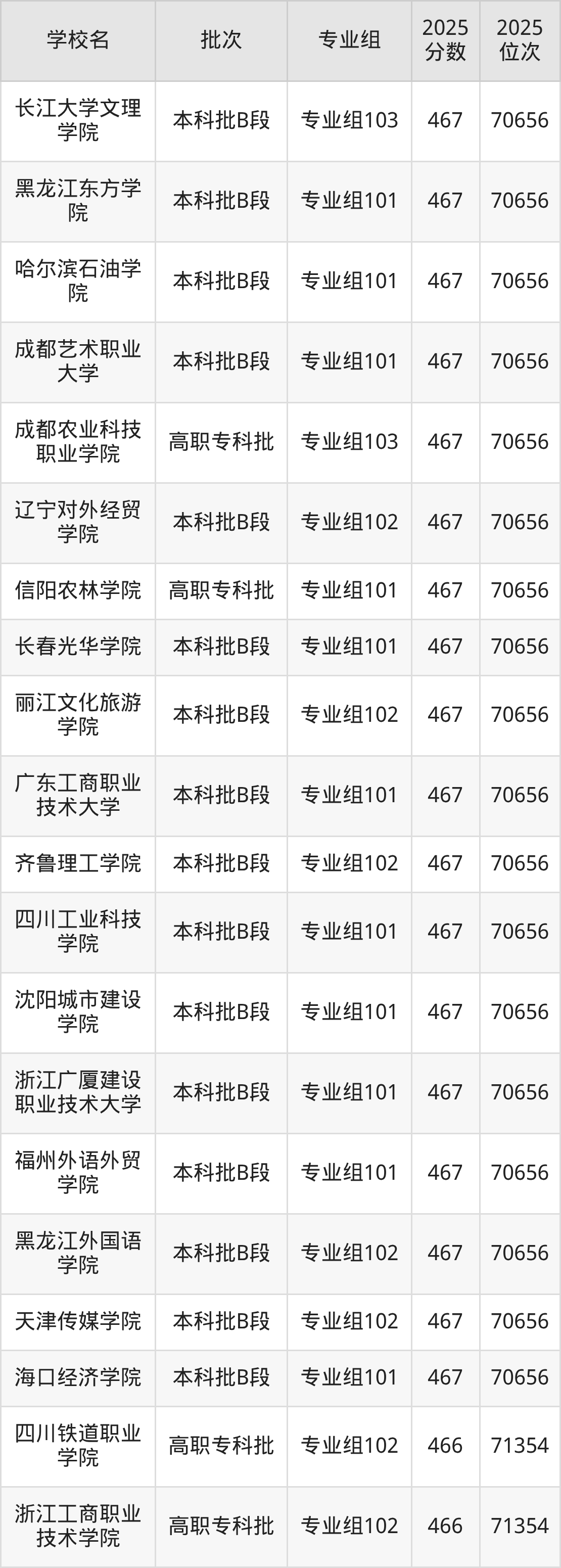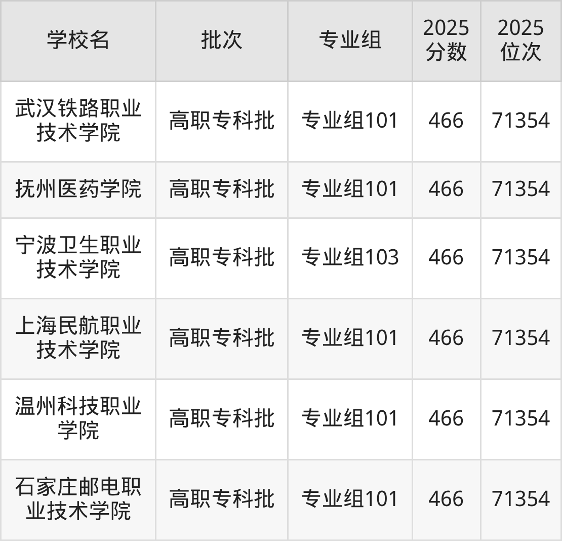 2025年四川高考历史类466分(70657名~71354名)能上的大学有温州科技职业学院专业组101、宁波卫生职业技术学院专业组103、武汉铁路职业技术学院专业组101、浙江工商职业技术学院专业组102等。