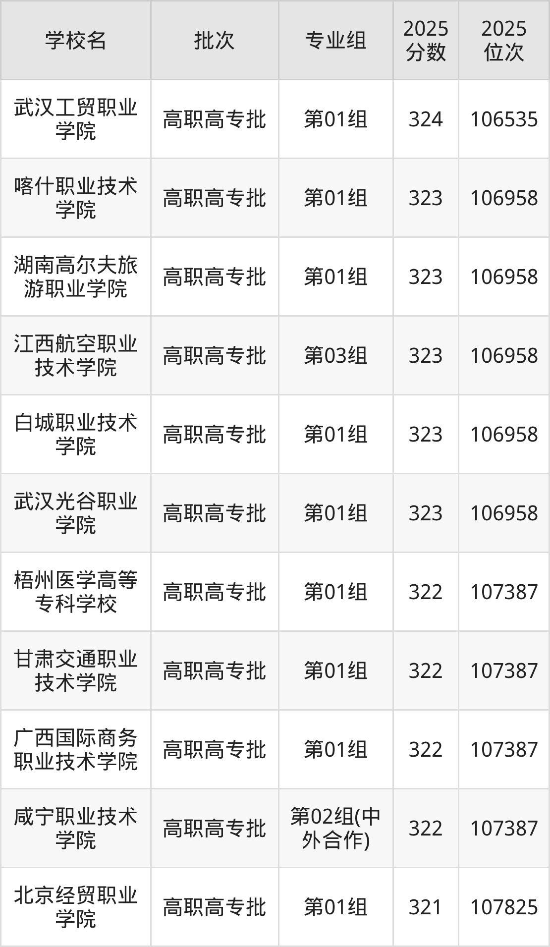 2025年湖北高考历史类322分(106959名~107387名)能上的大学有咸宁职业技术学院第02组(中外合作)、广西国际商务职业技术学院第01组、梧州医学高等专科学校第01组、甘肃交通职业技术学院第01组。