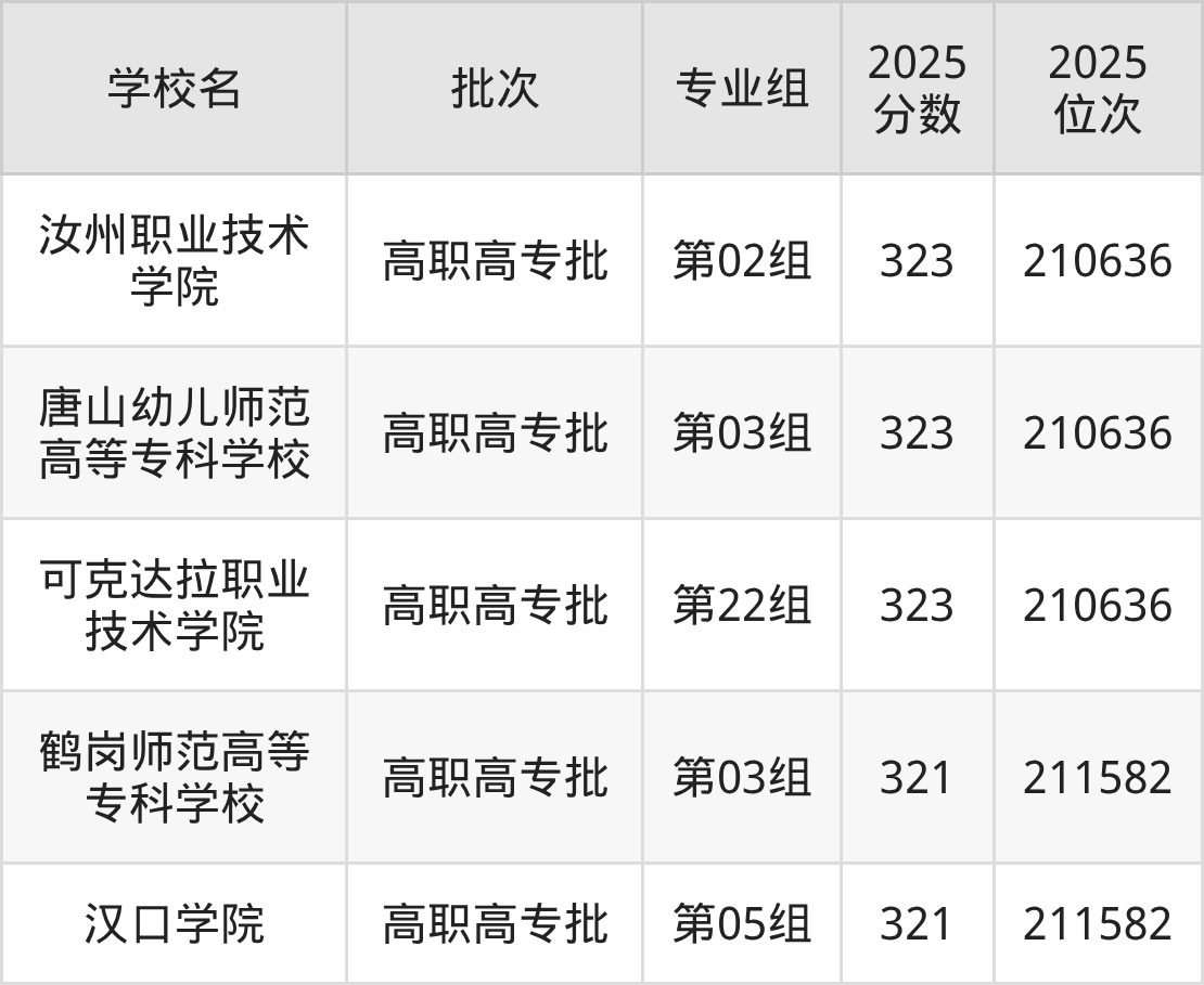 2025年湖北高考物理类322分(210637名~211089名)录取位次低于该区间(较稳妥)的有鹤岗师范高等专科学校第03组(211582名)、汉口学院第05组(211582名)等;录取位次高于该区间(可冲)的有唐山幼儿师范高等专科学校第03组(210636名)、可克达拉职业技术学院第22组(210636名)等。