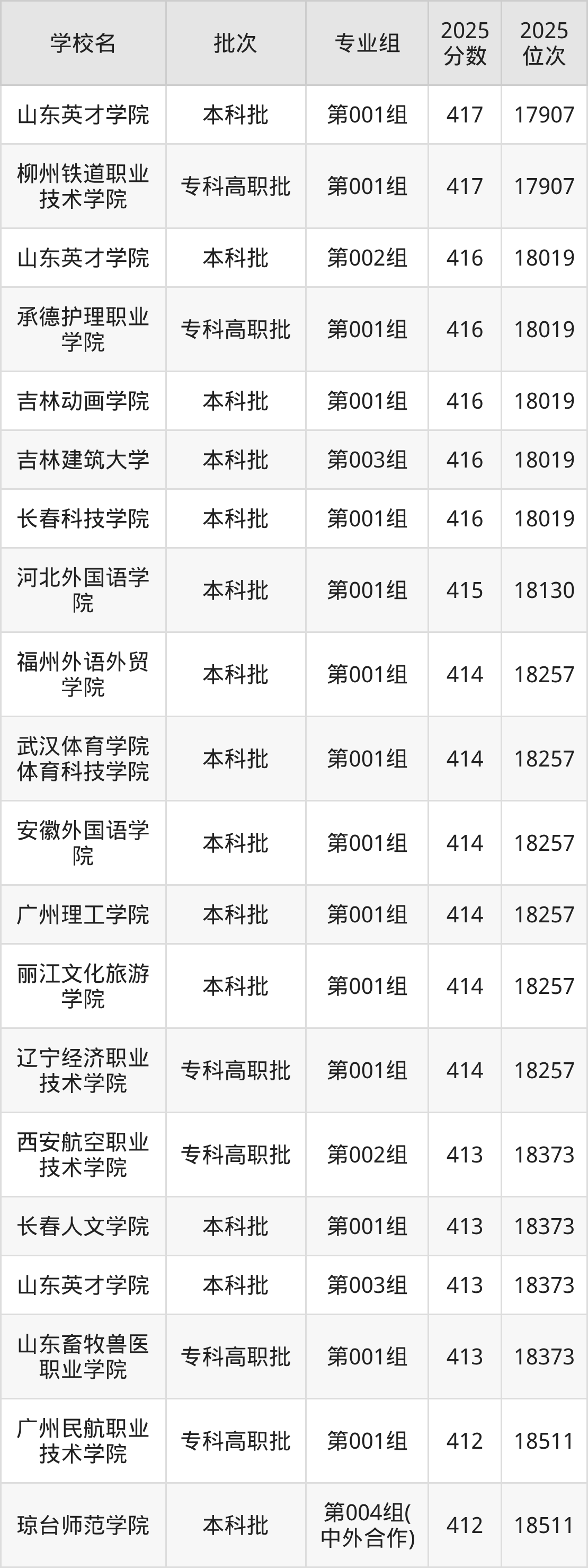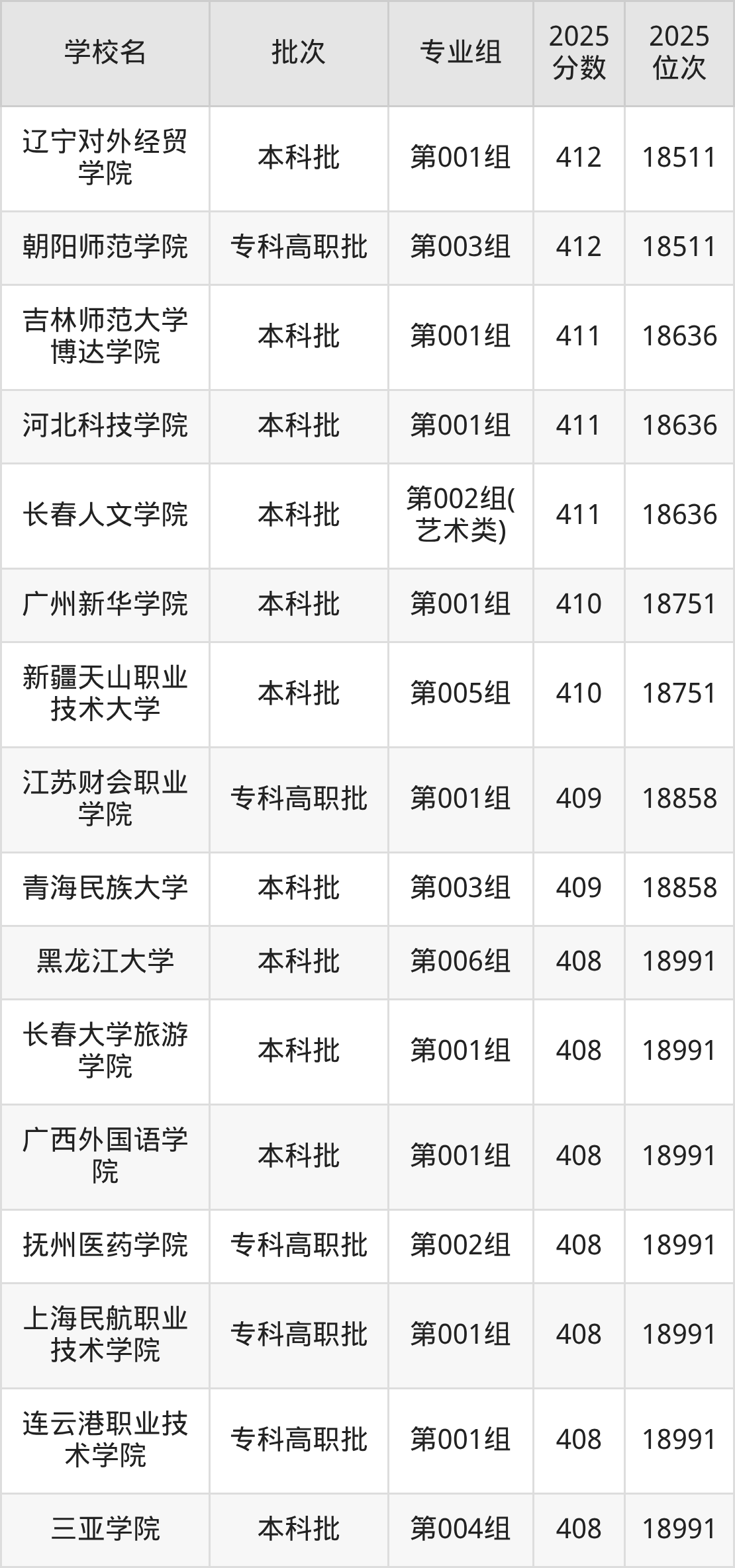 2025年吉林高考历史类412分(18374名~18511名)能上的大学有辽宁对外经贸学院第001组、琼台师范学院第004组(中外合作)、朝阳师范学院第003组、广州民航职业技术学院第001组。