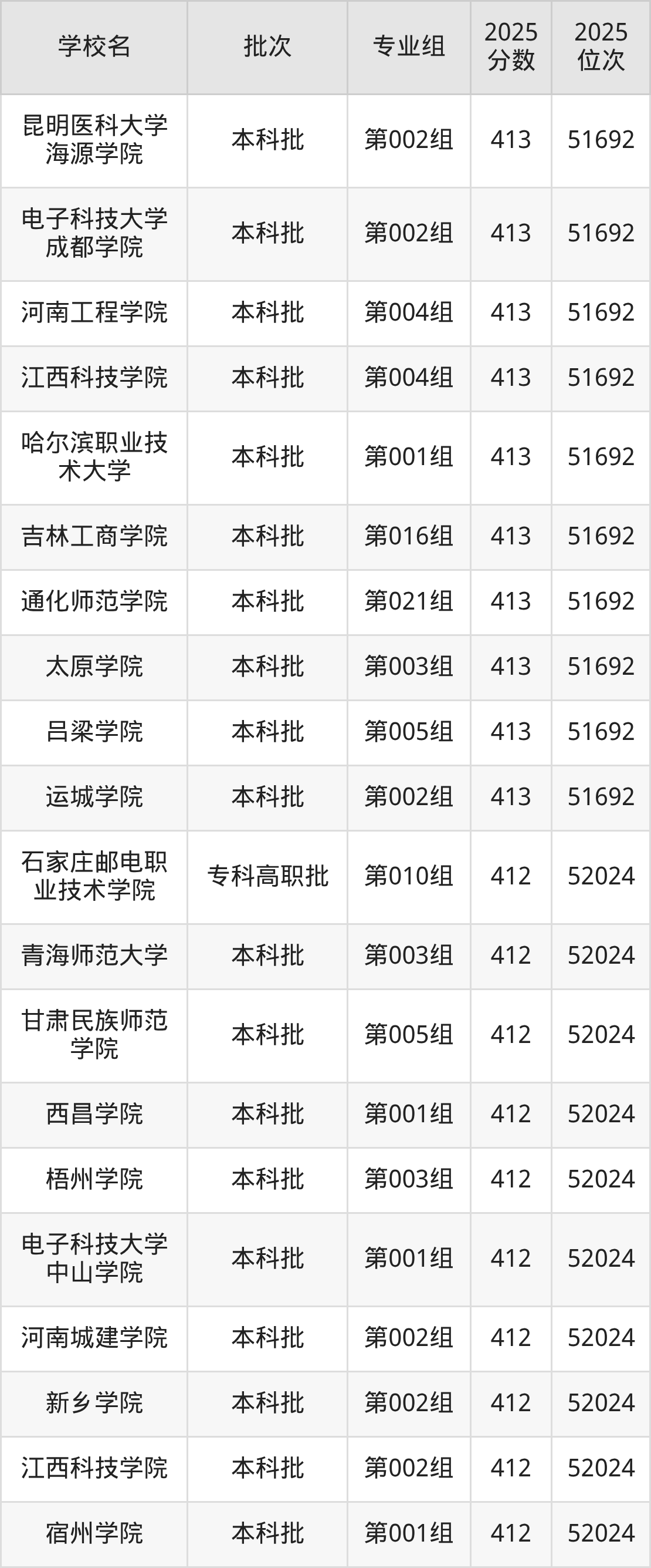 吉林高考412分:历史类排名18511位、物理类排名52024位。该分数位次对应能上的大学历史类有辽宁对外经贸学院第001组、琼台师范学院第004组(中外合作);物理类有内蒙古民族大学第012组、内蒙古科技大学包头师范学院第007组,更多名单如下文所示,2026届考生可参考。